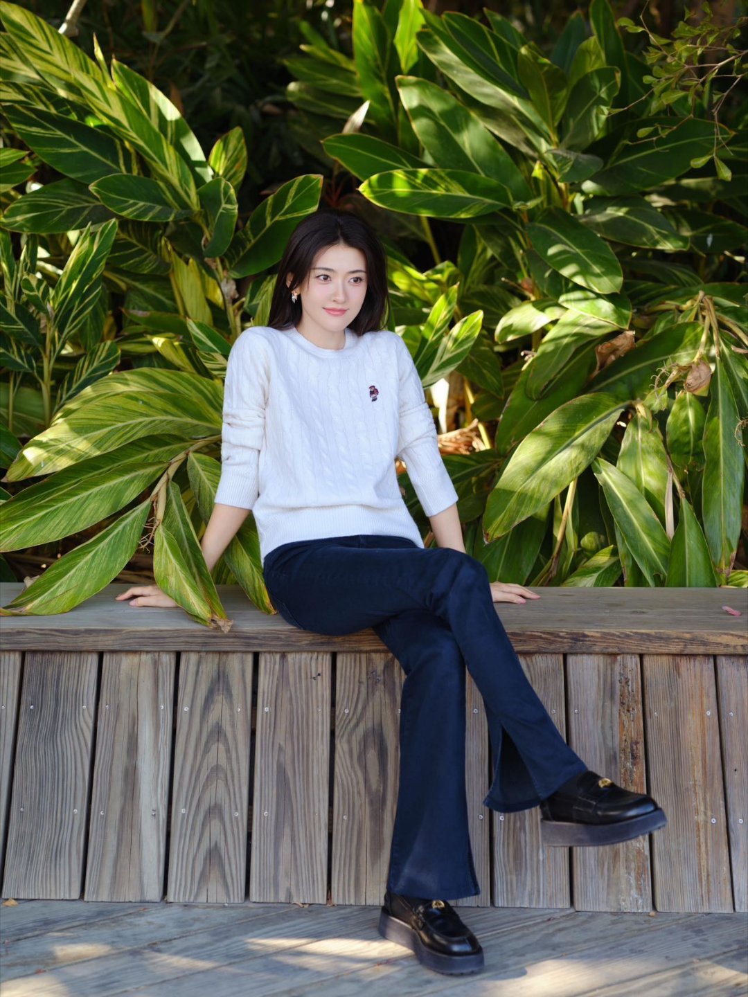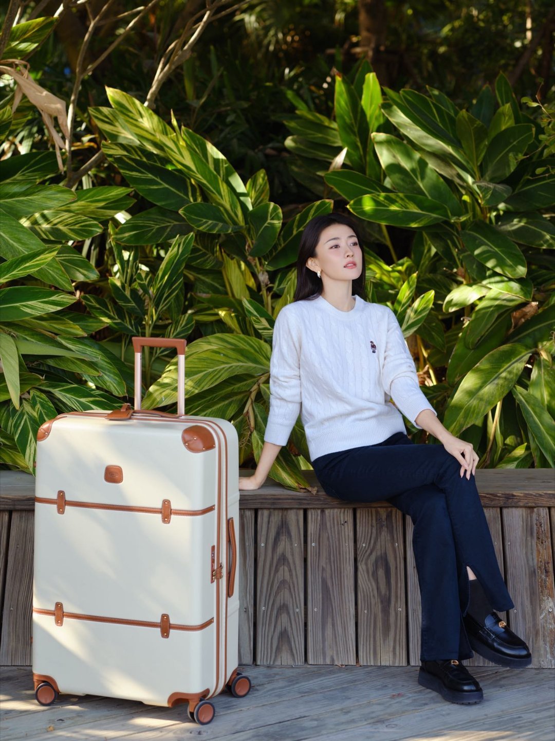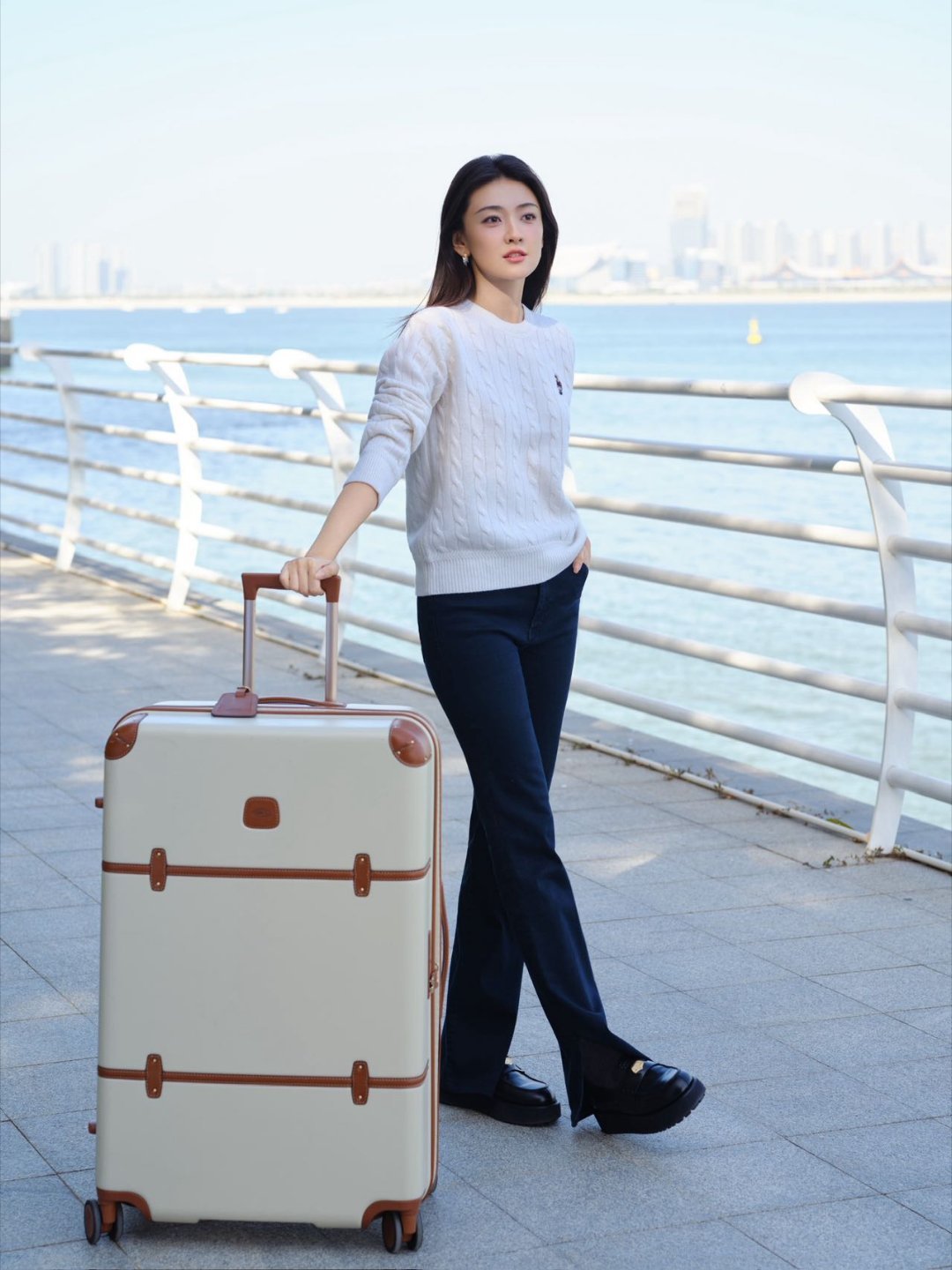 梁洁梁洁时尚明星同款 梁洁的营业造型也太会了!秋日海边的穿搭好有氛围感,米白绞花毛衣配藏蓝长裤,简约又大气,再搭个复古行李箱,时髦感upup,这波出行look直接抄作业了~