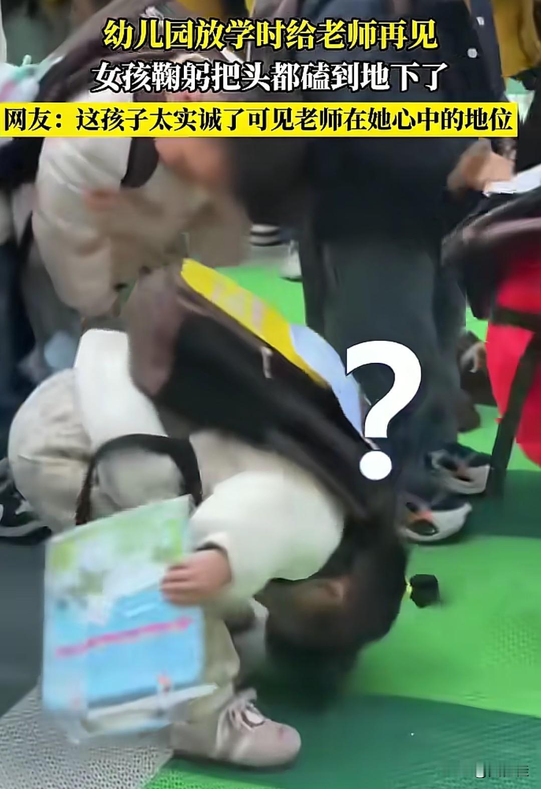儿园崽的鞠躬,直接把“尊敬”做到五体投地!放学跟老师说再见,这小不点心里门儿清,对老师的尊敬就该弯腰到底!腰一折直接贴腿,脑瓜“咚”地磕在地板上,生怕鞠躬少一分诚意。 她攥着小画纸埋着头,软乎乎的后脑勺对着老师,头发丝都跟着颤了颤。后颈窝露着细绒绒的汗毛,那实打实的架势,就是把“尊敬”俩字融进每一个弯腰的动作里,纯纯的童真又较真!