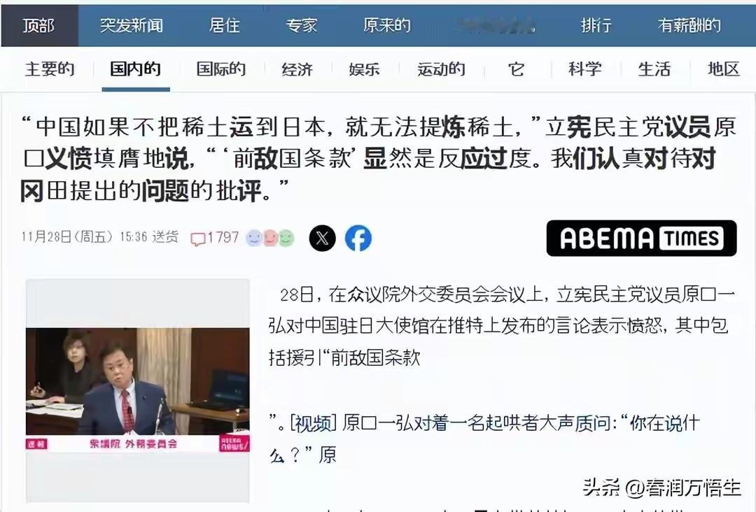 原来卡美国脖子的是小本子 11月28日,日本众议院外交委员会就“敌国条款”举行质询会 立宪民主党议员原口一博宣称“日本也掌握着中国稀土的命门”,即使中国拥有100%的稀土资源也没用,因为提炼技术在日本手中,“如果中国不把稀土运往日本,就无法完成精炼。 稀土供应链对国家经济有何影响 中国对美稀土 美国稀土需求 中美稀土之争 美国稀土战略 美国稀土订单 美国稀土事端 中美稀土谈判 中美稀土协议 日本稀土禁运 美日稀土合作