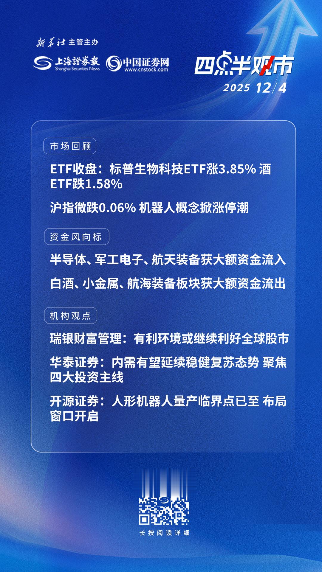 12月4日,A股市场全天横盘震荡,人形机器人、商业航天等题材表现活跃,带动创业板指相对强势。截至收盘,上证指数报3875.79点,跌0.06%;深证成指上涨0.40%,创业板指上涨1.01%。沪深两市合计成交1.55万亿元,较前一日缩量1210亿元。