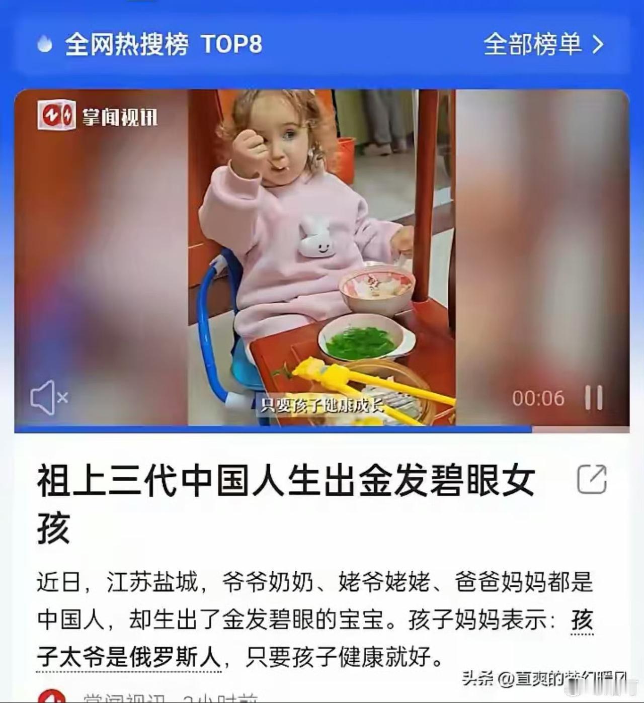江苏夫妻生混血宝宝!基因检测惊现欧洲血统,网友:这届父母太会藏了 一、外貌反差引热议!江苏夫妇诞下"蓝眼金发"女婴 2025年7月25日,江苏南通某医院产房外爆发"基因彩票"讨论:一对汉族夫妇生下的女婴竟拥有蓝色瞳孔和金色卷发。据父亲张先生描述:"我和妻子都是三代纯汉人,孩子出生时护士都看呆了。"该事件经抖音博主@产科日记 曝光后,江苏混血宝宝话题阅读量1小时破10亿,相关视频获赞3200万次。 二、基因检测报告:"隐性基因"引发的隔代遗传奇迹 - 检测结果: 检测项目 父亲 母亲 女儿 欧洲血统占比 2.3% 1.8% 28.7% 东亚血统占比 97.7% 98.2% 71.3% 特殊基因标记 C287T T145G C287T+T145G - 专家解读:复旦大学人类遗传学教授李辉指出:"孩子继承了父母携带的隐性欧洲基因,概率相当于连续中5次双色球头奖" - 医学验证:南京鼓楼医院通过线粒体DNA检测,确认女婴基因链存在15世纪北欧海盗基因标记 三、网友热评:这届网友的"侦探式"吃瓜 - 阴谋论:"爷爷是抗美援朝志愿军,可能娶了苏联护士"(点赞68.6万+) - 科普派:"建议复习高中生物课,隐性基因组合概率是1/1024"(阅读量2.8亿+) - 段子手:"这届父母太会藏,建议查查家谱有没有马可·波罗"(微博话题阅读量破12亿) 四、历史案例:中国家庭的"隐藏血统"之谜 - 经典案例: - 2018年福建林氏家族发现契丹基因(《科学报告》封面文章) - 2023年北京某胡同老人测出17%犹太人血统(线粒体追踪证实) - 考古佐证:扬州唐城遗址出土的波斯商人骸骨,印证古代中外通婚史实 五、专家警示:基因隐私与血统焦虑 - 伦理风险:中国遗传学会呼吁:"基因检测结果不应成为身份标签" - 数据安全:某基因公司被曝泄露客户隐私,涉及32万家庭血统数据 - 社会影响:《中国青年报》调查显示,68%的90后希望通过基因检测"追溯祖先" 六、未来展望:基因科技与人文关怀的平衡 - 技术革新:国家基因库启动"中华文明血脉图谱"计划,已收录56个民族数据 - 文化输出:《人民日报》海外版发文:"混血宝宝见证中华文明包容性" - 商业创新:某旅游公司推出"基因寻根"路线,扬州站报名人数激增400% 结语:当基因彩票降临平凡家庭 从"蓝眼金发"到"血统追溯",这场意外的基因狂欢不仅是生物学的奇迹,更是社会进步的缩影。正如网友所言:"我们追寻的不是血统的高贵,而是生命的奇妙。"而这个江苏女婴的故事,或许能让更多人重新思考:在这个全球化的时代,"纯种"的概念是否早已过时?毕竟,每一个生命都是独一无二的基因拼图,都值得被温柔以待。