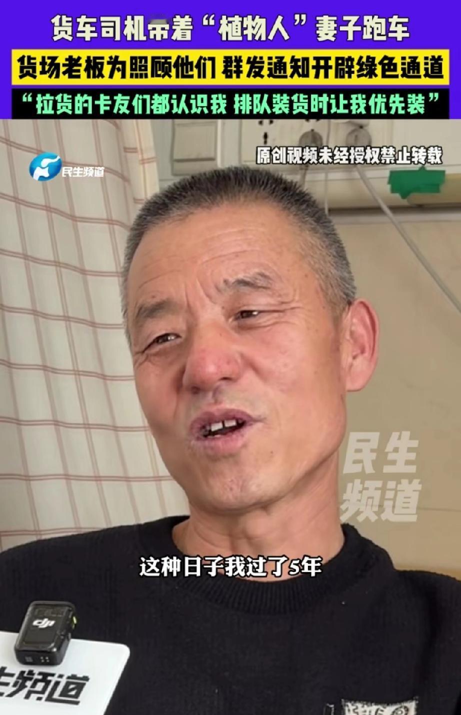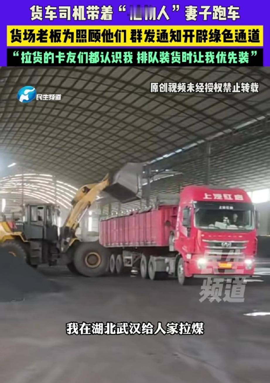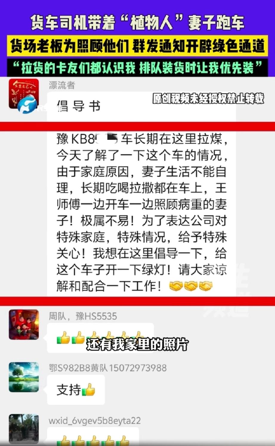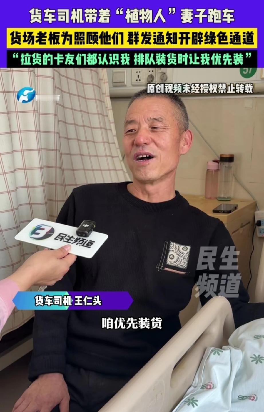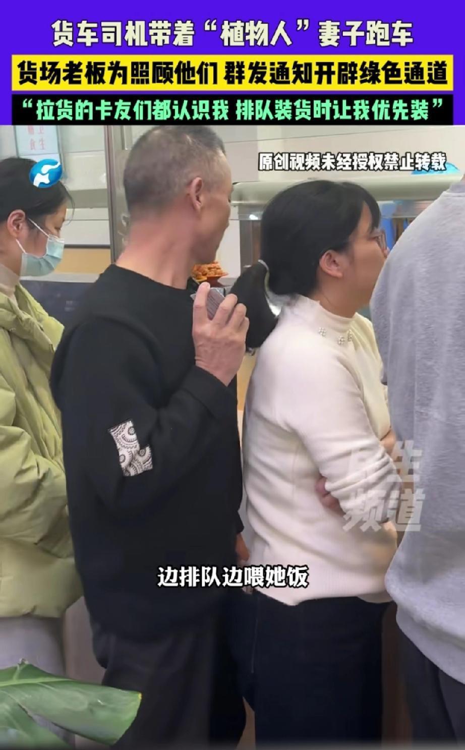 郑州货车司机王师傅,开着货车带着生活无法自理的“植物人”妻子一同工作。在湖北武汉拉煤时,货场老板看到他一边排队,一边喂妻子吃饭,了解到他家的情况和难处后,便在货车司机工作群里发出倡议:“希望大家让这位司机优先装货,好让他节省时间照顾妻子。” 群里的货车司机纷纷响应号召。 此后,货车司机圈都知晓了他的情况,无论他走到哪儿,都会得到老板与货友们的照顾。 五年过去,王师傅的妻子逐渐恢复意识,虽还不能完全自理,但正在慢慢康复。 王师傅把自己的经历发到网上,感谢全国各地货场老板和货友们多年来的照顾,让他有勇气直面生活的艰难,日子也渐渐好起来。 王师傅是个好男人,对生病的发妻不离不弃,这份深情与担当令人动容, 是他的坚守与温柔打动了所有人,善意才愿向他汇聚。 人间处处有温情,善良是人性最初的模样。日子越暖,越要让善意随心而行,让这份温暖铺满人间、传递四方。 来源:河南广播电视台民生频道