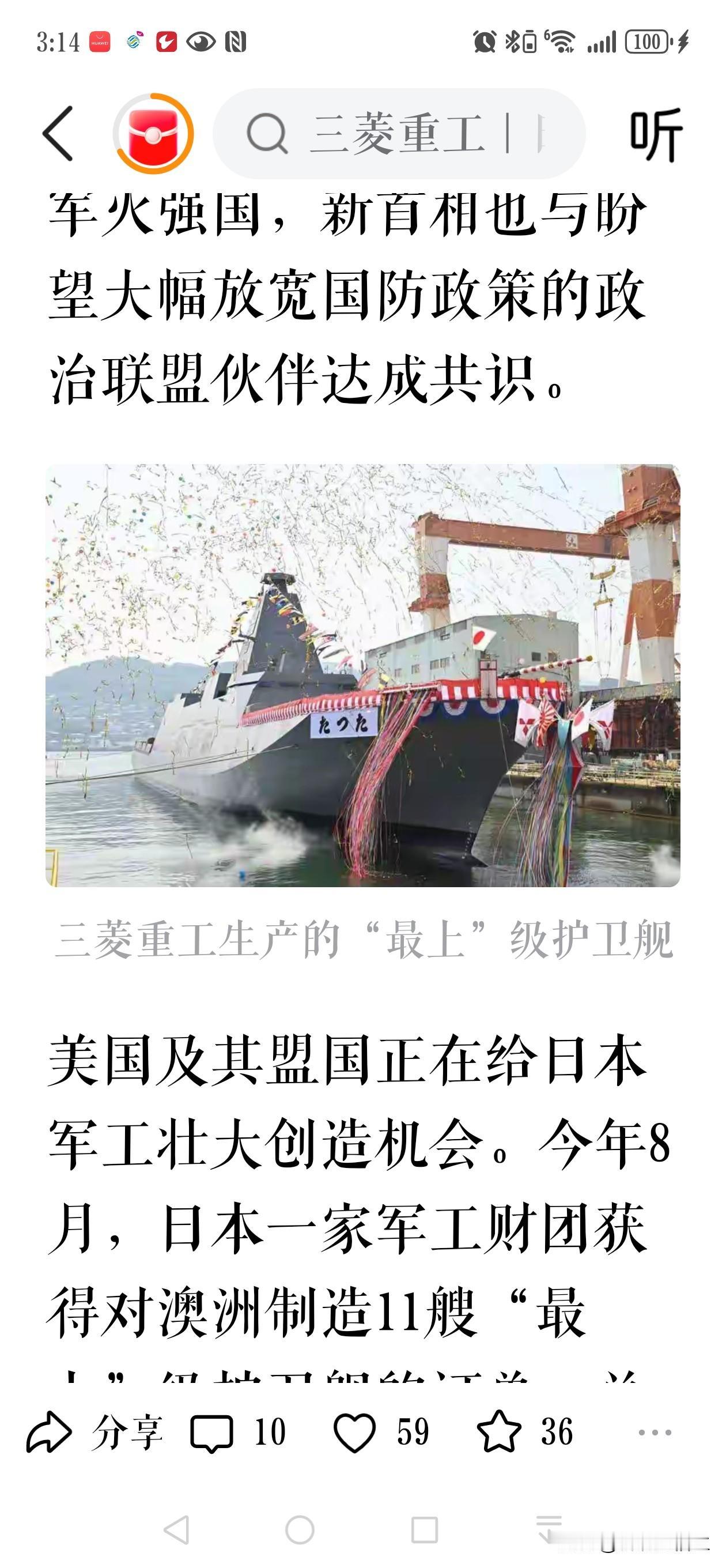 一面扎刀使绊,一面求财捞钱——日本人的两面三刀 日本经济团体联合会会长筒井义信前脚会见了中国驻日本大使吴江浩,请求中方允许日本经济代表团于明年1月访华。 后脚就日本正在就出口03式中程地对空导弹与菲律宾方面进行非正式磋商。 一些日本知名的军工企业品牌,包括三菱重工、川崎重工、三菱电机、NEC、三菱重工业、富士重工业、川崎重工、日本制钢所、小松制作所、日立制作所、三井造船、石川岛播磨重工业、日本电气、住友重工业、富士通、日本化药等,业务涵盖海陆空天全领域。 日本军工企业2023~2024年营收增长40%,增幅位居第一。 依序为:三菱电机(+86.9%)、日本电气(+42.6%)、三菱重工(+36.7%)、川崎重工(+35.9%)、富士通(+25.1%)等。 据日本《产经新闻》《日本经济新闻》报道,日本军工企业整体营收额合计133亿美元,其中三菱重工、川崎重工、石川岛播磨重工(IHI)三大军工巨头2024财年的防务业务收入合计将达15110亿日元(约合97亿美元),比上一财年增长25%;三菱重工武器相关销售额增37%,达50亿美元,其中大部分来自飞机和导弹系统的销售。 日本的三菱不仅生产三菱汽车,三菱重工生成主要军工大件装备有以下这些: F2支援战斗机 F15J战斗机 F35A战斗机 H2A/HIIB火箭 UH60J黑鹰直升机 "苍龙"级/"大鲸"级潜艇(日本最先进常规潜艇,占自卫队潜艇50%以上) "最上"级护卫舰、"出云"级直升机航母(占自卫队驱逐舰约1/3) 宙斯盾驱逐舰(第一代和第二代) 10式/90式主战坦克(日本唯一坦克制造商) 89式步兵战车、87式自行高炮、91式架桥坦克 90式舰对舰导弹、12式岸舰导弹(射程1000km+) AAM4B中距空对空导弹、AAM3近距空对空导弹 爱国者导弹系统(日本国内主要生产商) 没有这些财团支持,日本右翼还会有那么狂妄么