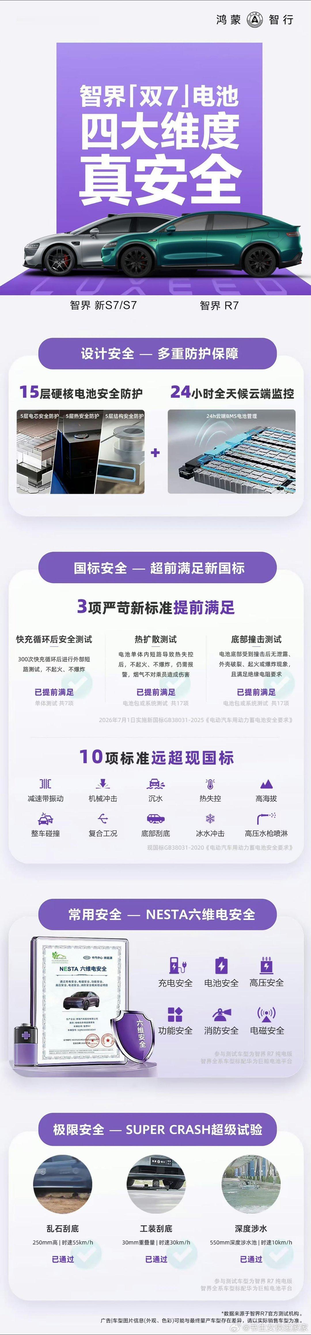 智界巨鲸800V高压电池平台的顶级安全水准。智界R7十万公里的电池健康度97%,大幅优于行业平均水平;72秒穿过100米地火,电池依旧稳定;行业首次整车三元锂穿刺,电池仅冒烟无起火;BMS系统毫秒级响应,实打实展现出“危险可控、逃生有时”的安全实力。顶级安全的背后是巨鲸电池15层安全防护体系,结合华为自研AI预警+BMS毫秒级响应+云端协同,为用户带来了“单电芯失控,整包永不起火”的顶级安全体验,再次诠释“安全才是最大的豪华”的品牌理念。