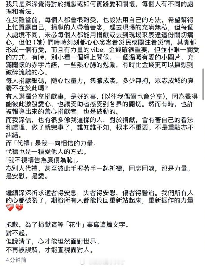 别让爱心变了味,郑秀文针对被质疑没捐款一事特意发长文解释,香港火灾后的28号就通