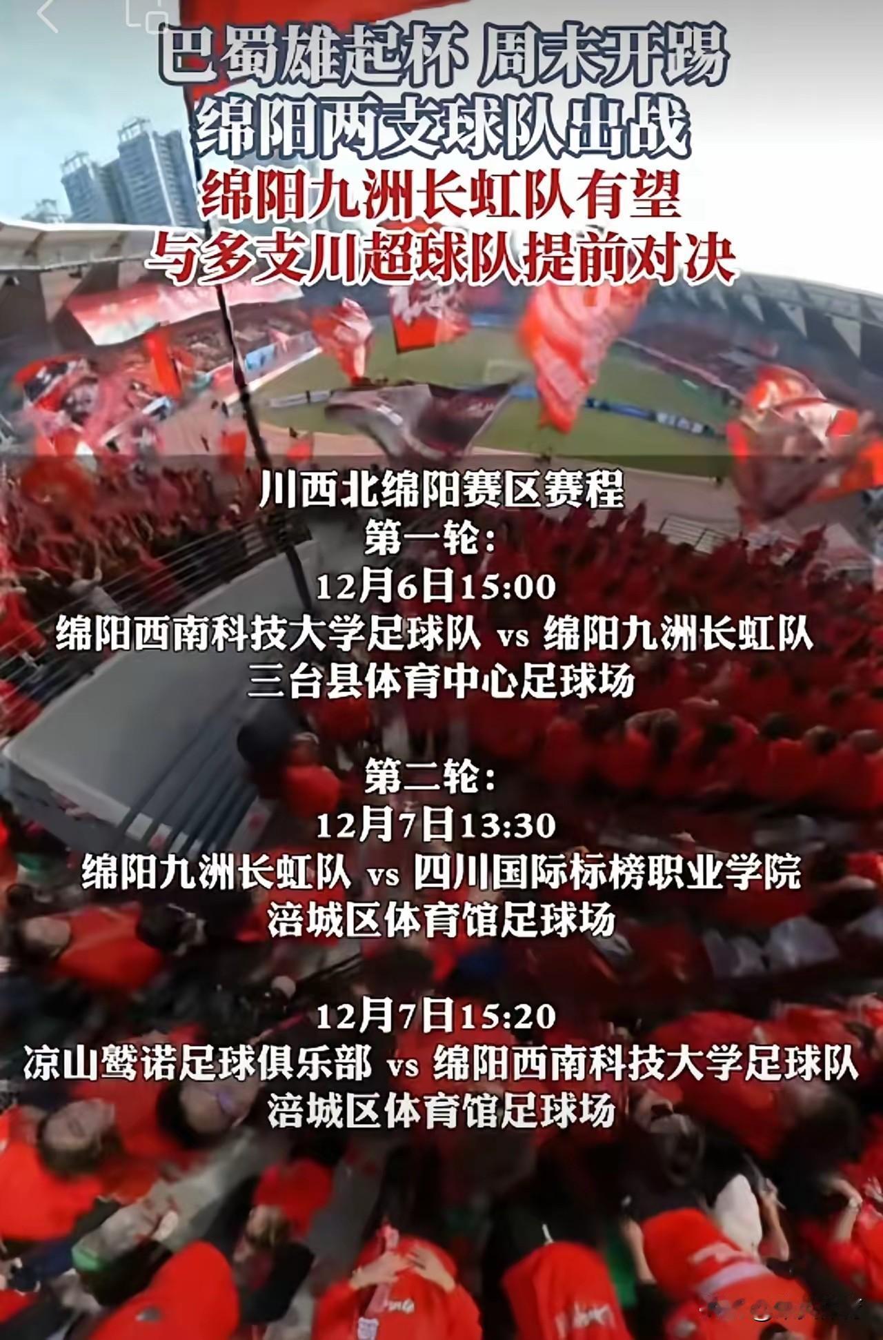 川超联赛小组分区赛刚刚降下帷幕!四川又一传统业余足球联赛又将于12月6日重燃战火!东西南北四个小组将先进行小组赛! 与川超不同的是!此项赛事小组赛将进行赛会制,每个对手之间进行单循环比赛,决出最终的小组前两名! 而绵阳九州长虹队则与德阳剑南春.金汇;绵阳西科大;成都宇辉仁德;成都顶耀锦城;德阳C37足球队;凉山鹫诺足球俱乐部;四川标榜国际足球学院同组! 刚刚在川超联赛突出重围的绵阳九州长虹队在本次强队环伺的情况下,还能顺利杀出重围!顺利晋级吗!