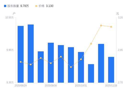 日期A股户数(户)流通A股户均持股数(股)户均持股市值(万元)2025-11-289775427787.078.702025-11-2010015527120.938.522025-11-109641428173.268.452025-10-319866827529.667.932025-10-209955427284.667.692025-10-109994027179.287.882025-09-3010037627061.227.712025-09-209877527499.847.952025-09-1010374826181.687.442025-08-2910347826249.997.51