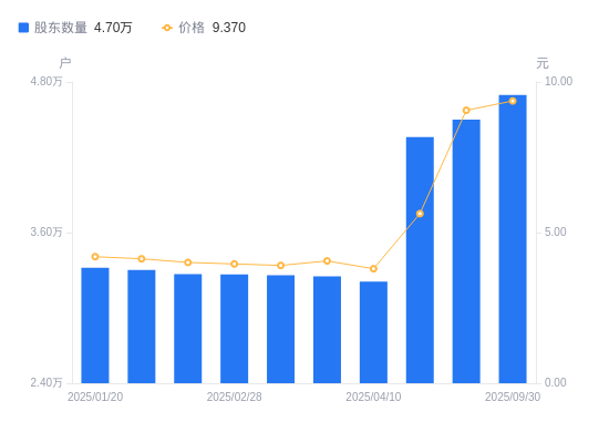日期A股户数(户)流通A股户均持股数(股)户均持股市值(万元)2025-11-284479819172.8317.542025-10-314803217881.9216.022025-09-304696418288.5717.142025-09-194499419089.3117.292025-06-304361719691.9711.092025-04-103209326762.9910.172025-03-313250926420.5110.732025-03-103260326344.3410.302025-02-283266526294.3410.412025-02-203268326279.8510.54