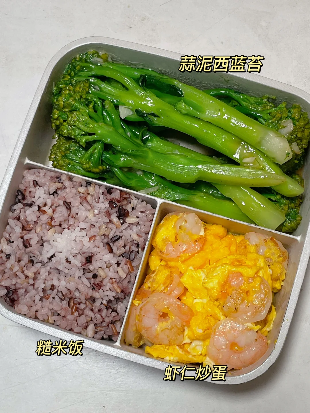 📍糙米饭+虾仁炒鸡蛋+蒜泥西蓝苔