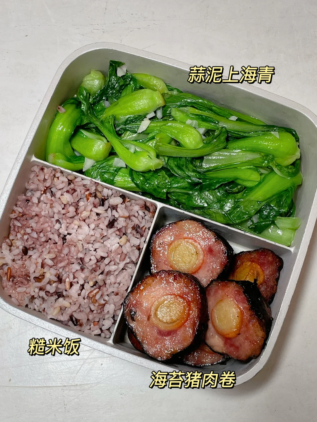 📍糙米饭+海苔猪肉卷+蒜泥上海青