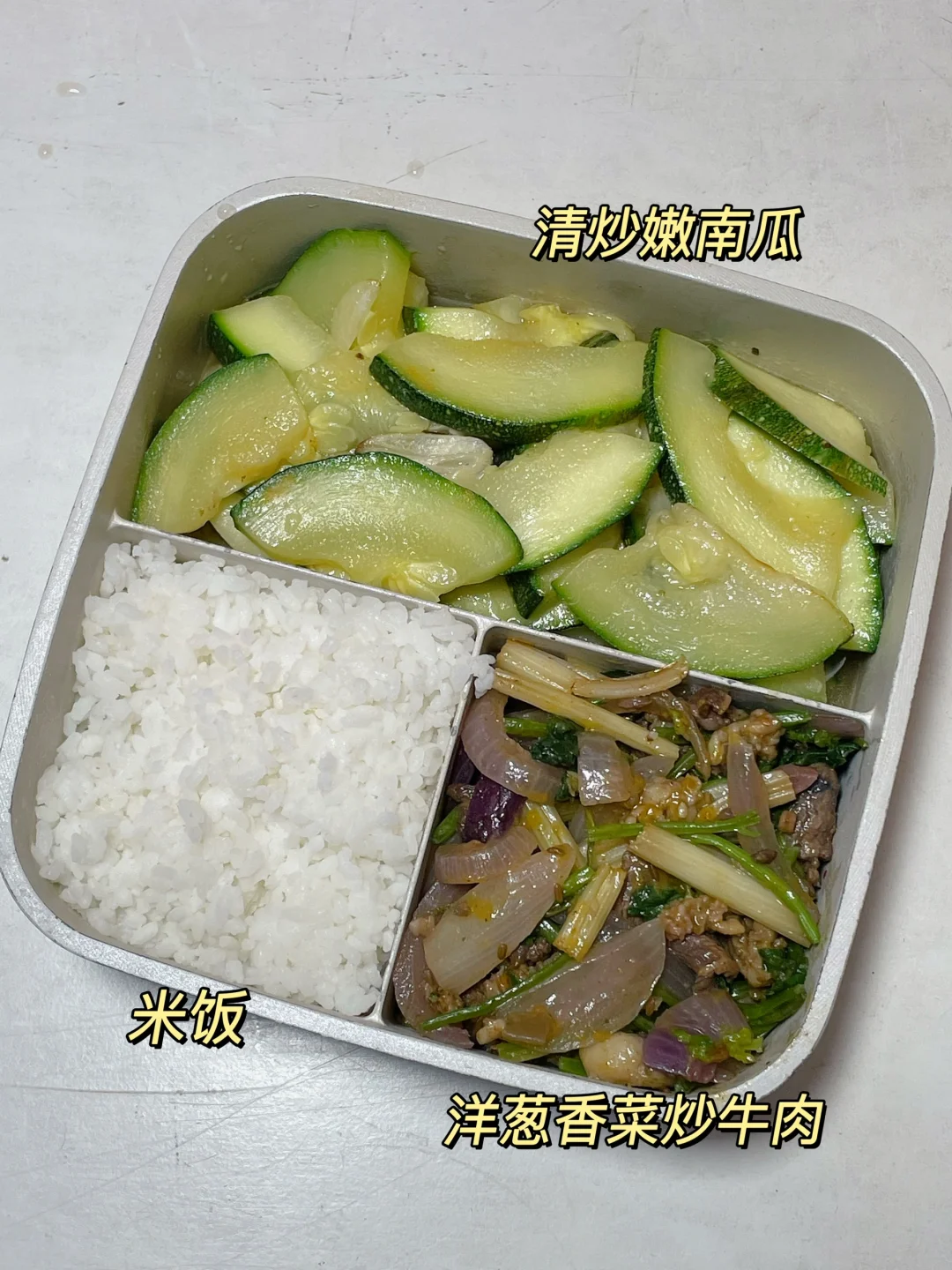 📍米饭+洋葱香菜炒牛肉+清炒嫩南瓜