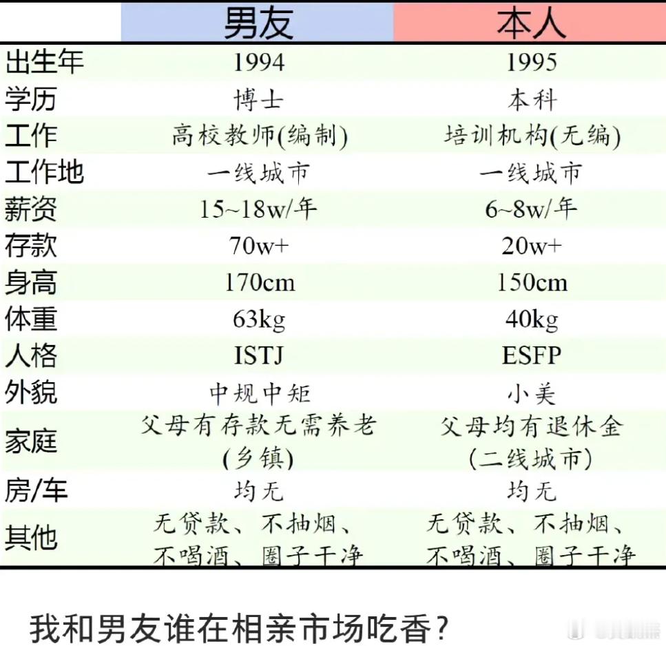 一位女网友询问,她和她男朋友谁在相亲市场上更吃香。你们觉得呢?
