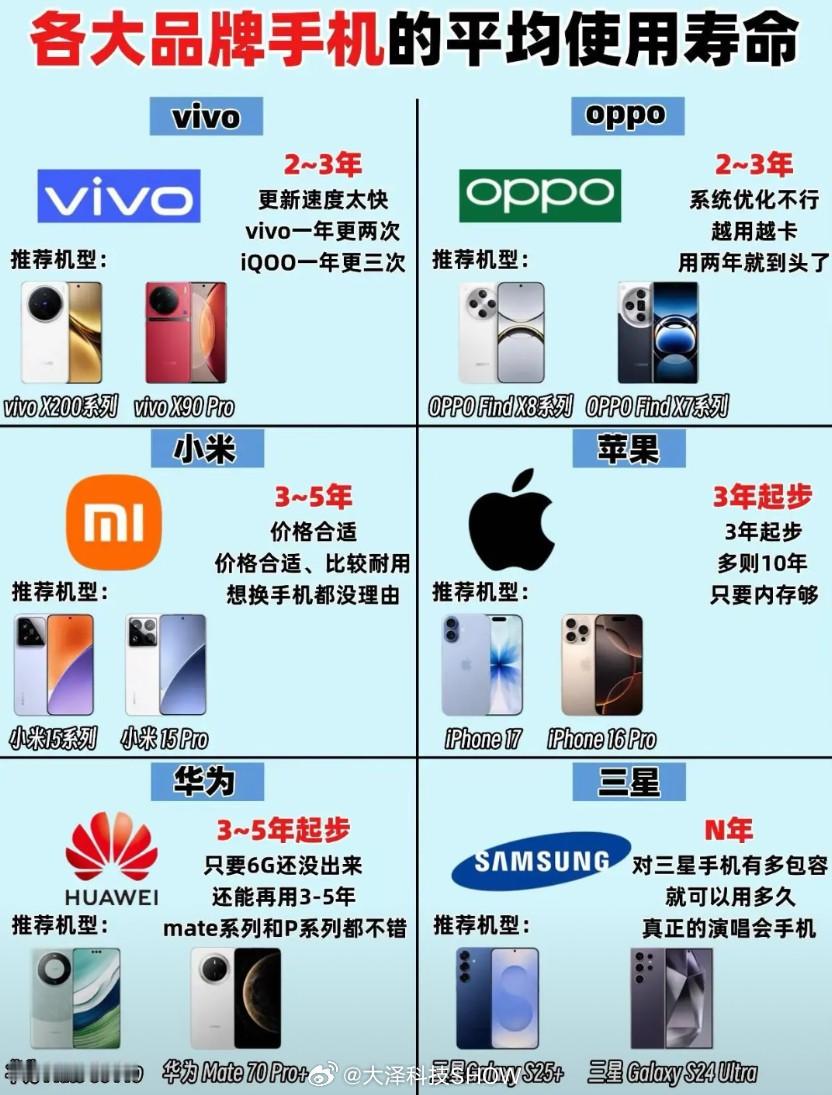 不同手机品牌寿命大不同,苹果3年起步多则10年,小米3-5年价格合适,华为还能再