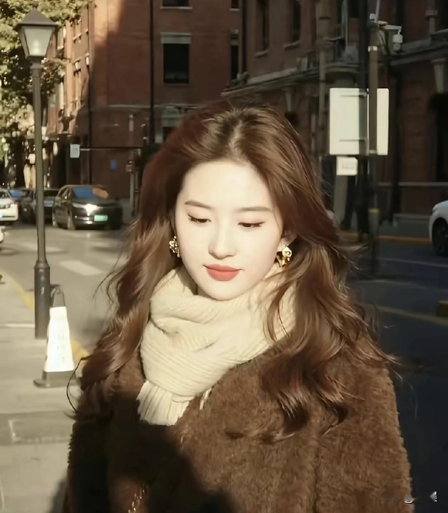 刘亦菲暖棕色毛绒外套搭配温柔的米杏色内搭,金色耳饰造型