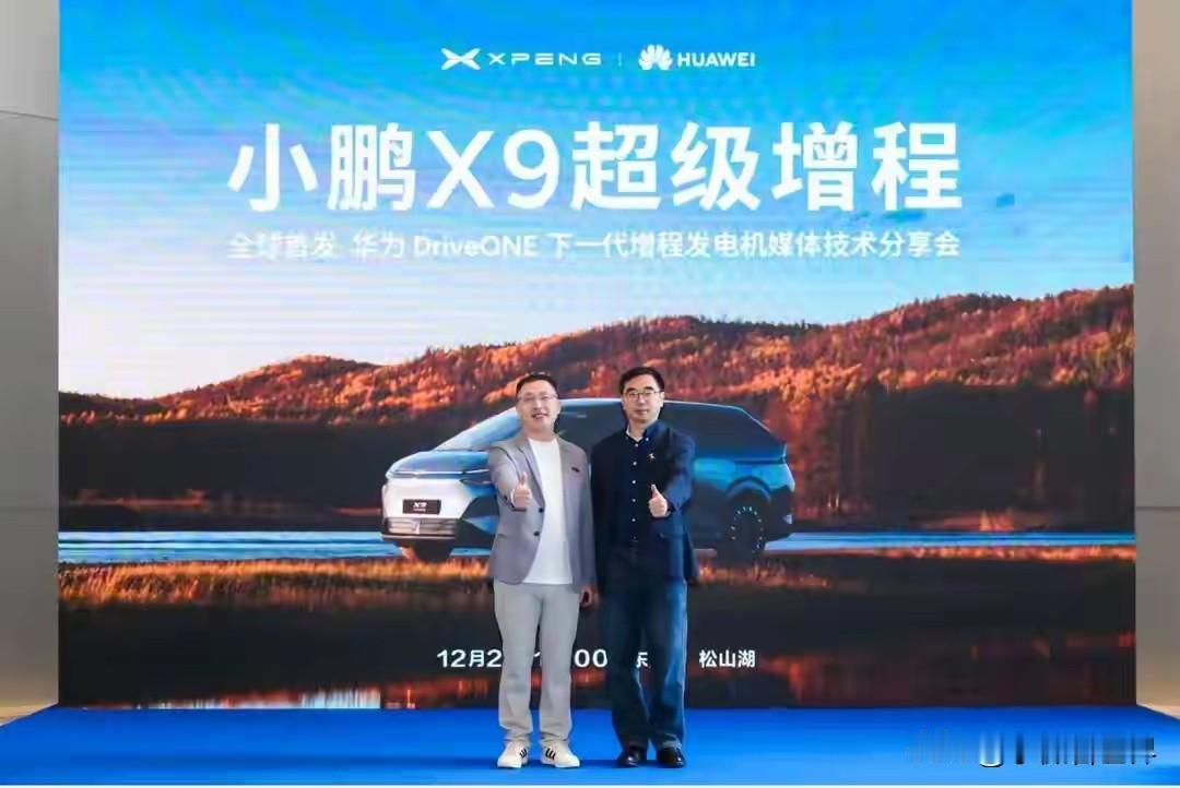不但雷军没想到,就连销售大王王传福也没想到—— 12月2日,小鹏汽车与华为共同宣布,小鹏X9超级增程全球首发华为DriveONE全栈高集成高压油冷发电机。 可以毫不夸张地说,华为DriveONE全栈高集成高压油冷发电机,具备“强”与“静”两大核心特性,为小鹏X9超级增程提供更稳定的效率以及安静无感的增程体验。 这款被称为“行业功率密度最高”的增程发电机,解决了大七座增程车的空间、效率、保电、NVH四大核心痛点,让X9实现1602km综合续航、亏电油耗最低的表现。 因此小鹏X9超级增程,实现了“纯电续航长、充电速度快、亏电动力足、综合能耗低、增程噪音低、空间集成高”硬实力的技术核心,确保车辆在高速行驶、爬坡等高负荷场景下依然电力充沛。 人们最关心的续航与补能方面,其搭载增程专属超快充磷酸铁锂大电池与60L大油箱,实现CLTC纯电续航452km、综合续航1602km的表现。 同时匹配5C+800V超充技术,充电12分钟可补能至70%SOC,减少用户充电等待时间。 至于安全性方面,小鹏X9超级增程全面满足2024版C-NCAP五星安全、2023版中保研G+全优设计标准,以及2026版欧洲最高安全法规E-NCAP安全设计标准。 新车推出Max和Ultra两个版本,预售价格分别为35万元和37万元,即日起至新车上市日,消费者可享受多重预订权益。
