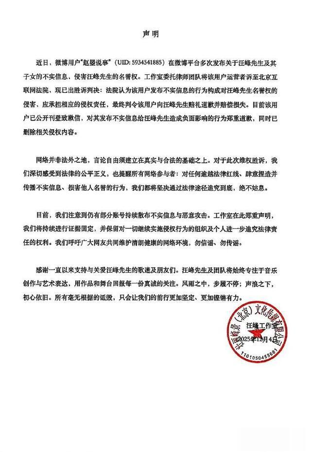 12月4日,@汪峰工作室发布严正声明:近期,大量网络用户发布关于汪峰先生及家庭成员的不实信息,该行为已构成名誉权侵权。