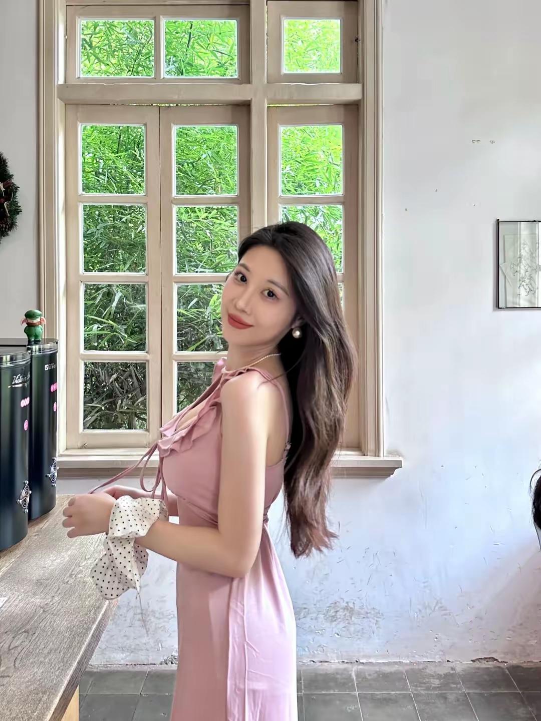 优雅粉色连衣裙,复古咖啡馆,绿植映衬,少女心满满