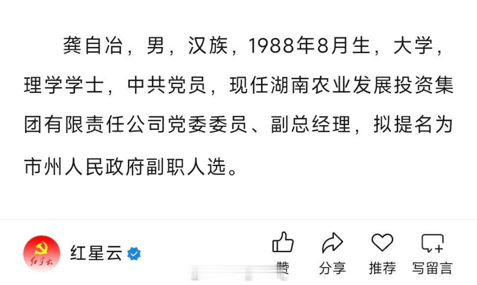 1988年出生,湖南农业发展投资集团副总经理龚自冶,拟提名为市州人民政府副职人选。