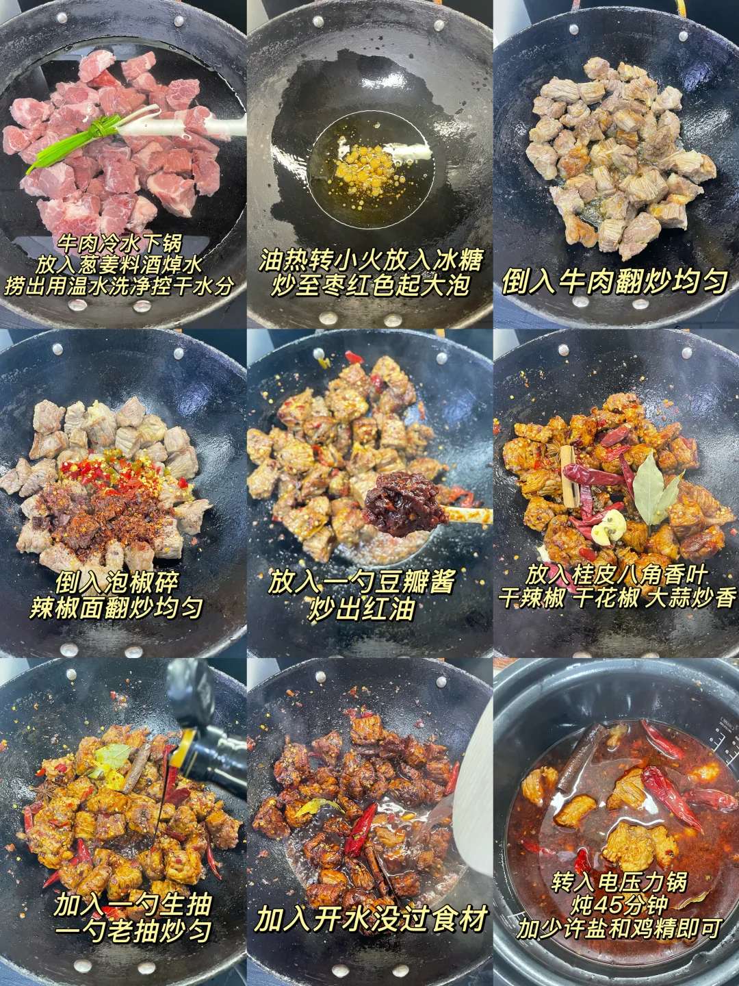 2⃣️:锅中油热转小火,放入冰糖慢炒至枣红色起大泡,倒入牛肉炒匀,加入泡椒碎 辣椒面炒匀,再加入一勺豆瓣酱炒出红油,倒入大蒜 葱段 干辣椒 桂皮 八角 香叶 炒香,加入一勺生抽和老抽翻炒上色,转入电压力锅,倒入开水,压力炖45分钟,加点盐和鸡精调味