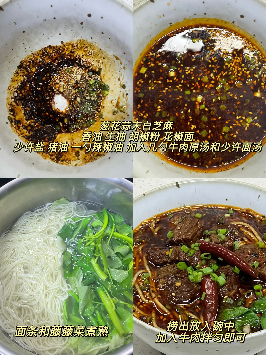 3⃣️:碗中加入葱花 蒜末 香油 生抽 胡椒粉 花椒面 少许盐和猪油 一勺红油辣椒,加入牛肉原汤和少许开水,水开放入面条和青菜煮熟,捞出放入调料中,放入多多的牛肉,撒点葱花拌匀即可