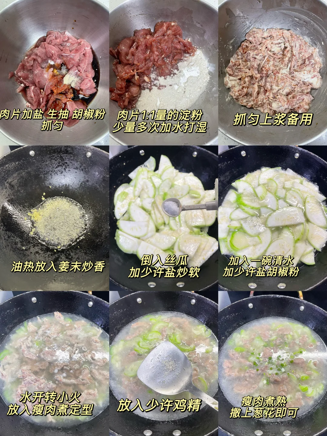 2️⃣:锅中油热(猪油更好)放入姜末炒香,倒入丝瓜,加少许盐炒出水分,加入一碗水烧开,加入盐 胡椒粉调味,转小火一片片放入滑肉(放肉的过程动作要轻)煮定型,转中火煮熟,起锅前加入鸡精即可