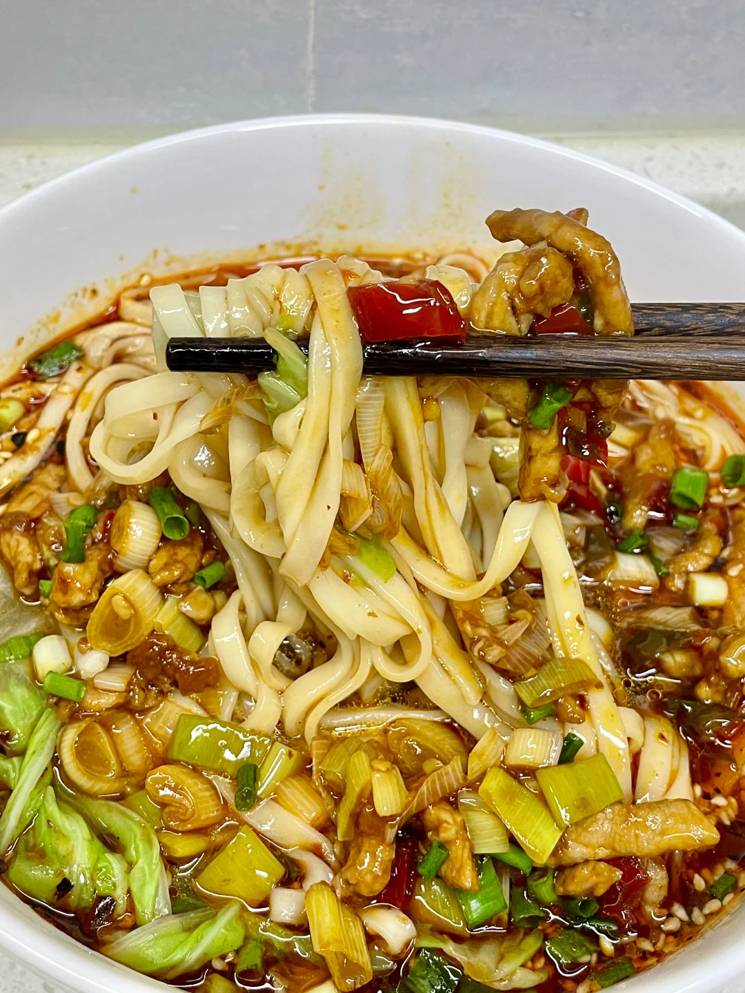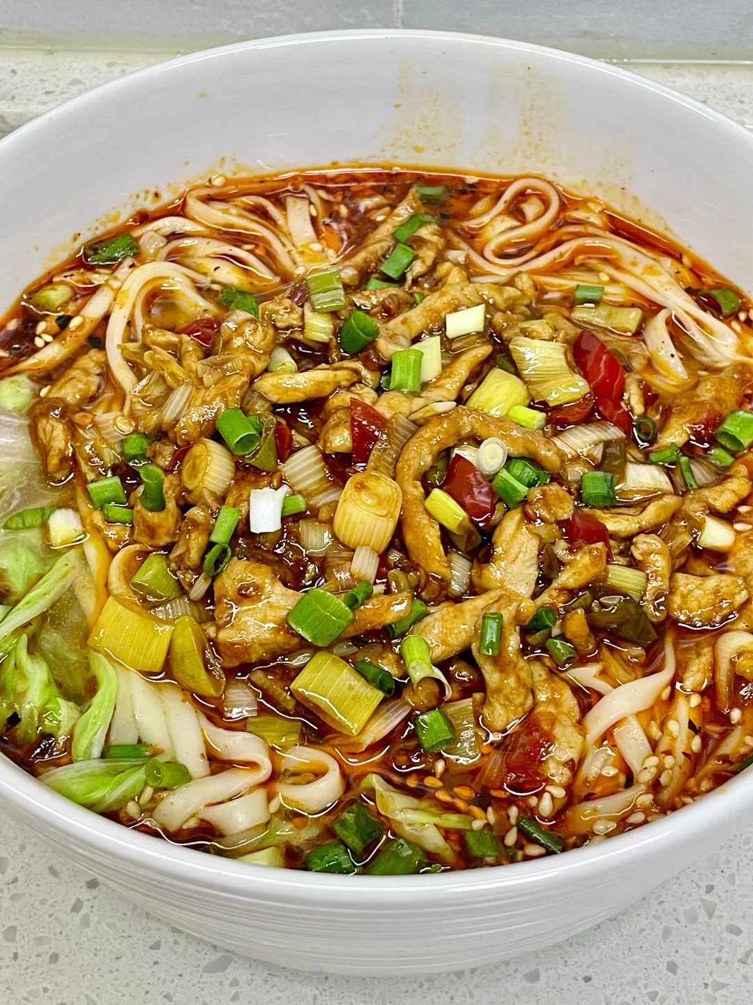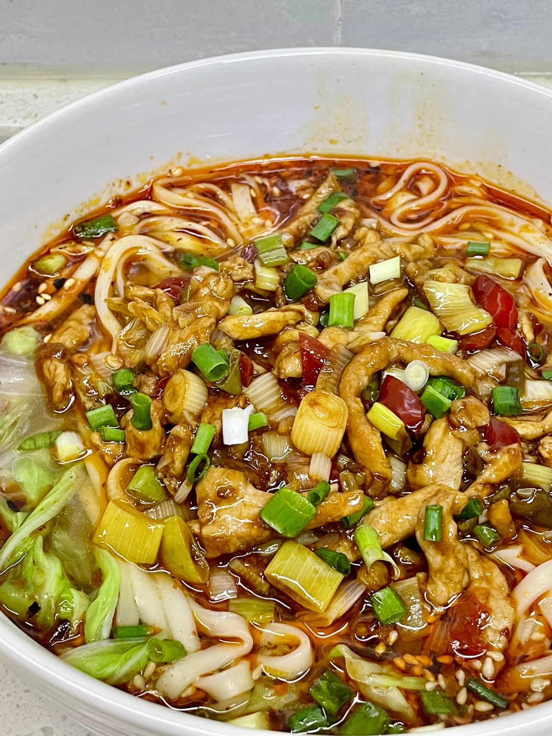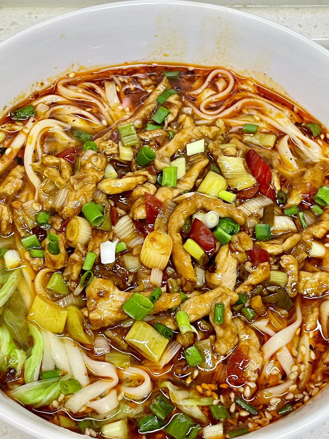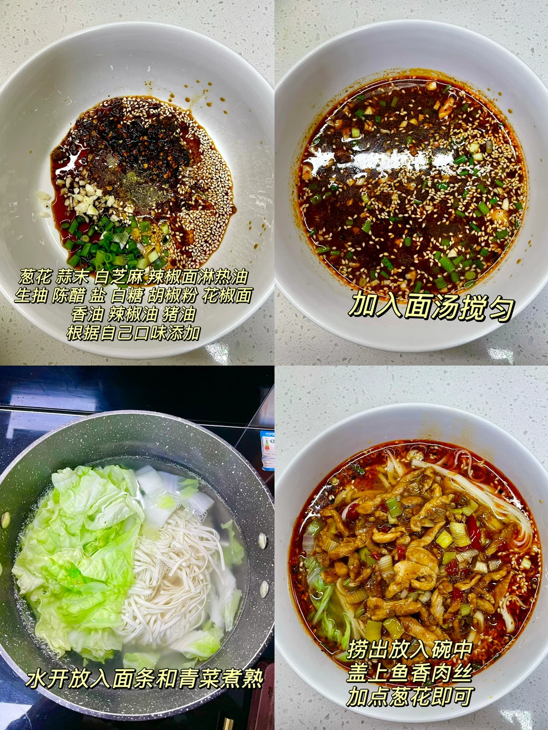 4⃣️:碗中加入葱花 蒜末 白芝麻 辣椒面淋热油,再加入一勺生抽 适量陈醋 少许盐鸡精 胡椒粉 花椒面 适量香油 猪油 1勺辣椒油(可根据自己口味酌情增减)水开加入适量面汤搅匀,放入面条和青菜煮熟捞出,盖上多多的鱼香肉丝,撒点葱花即可