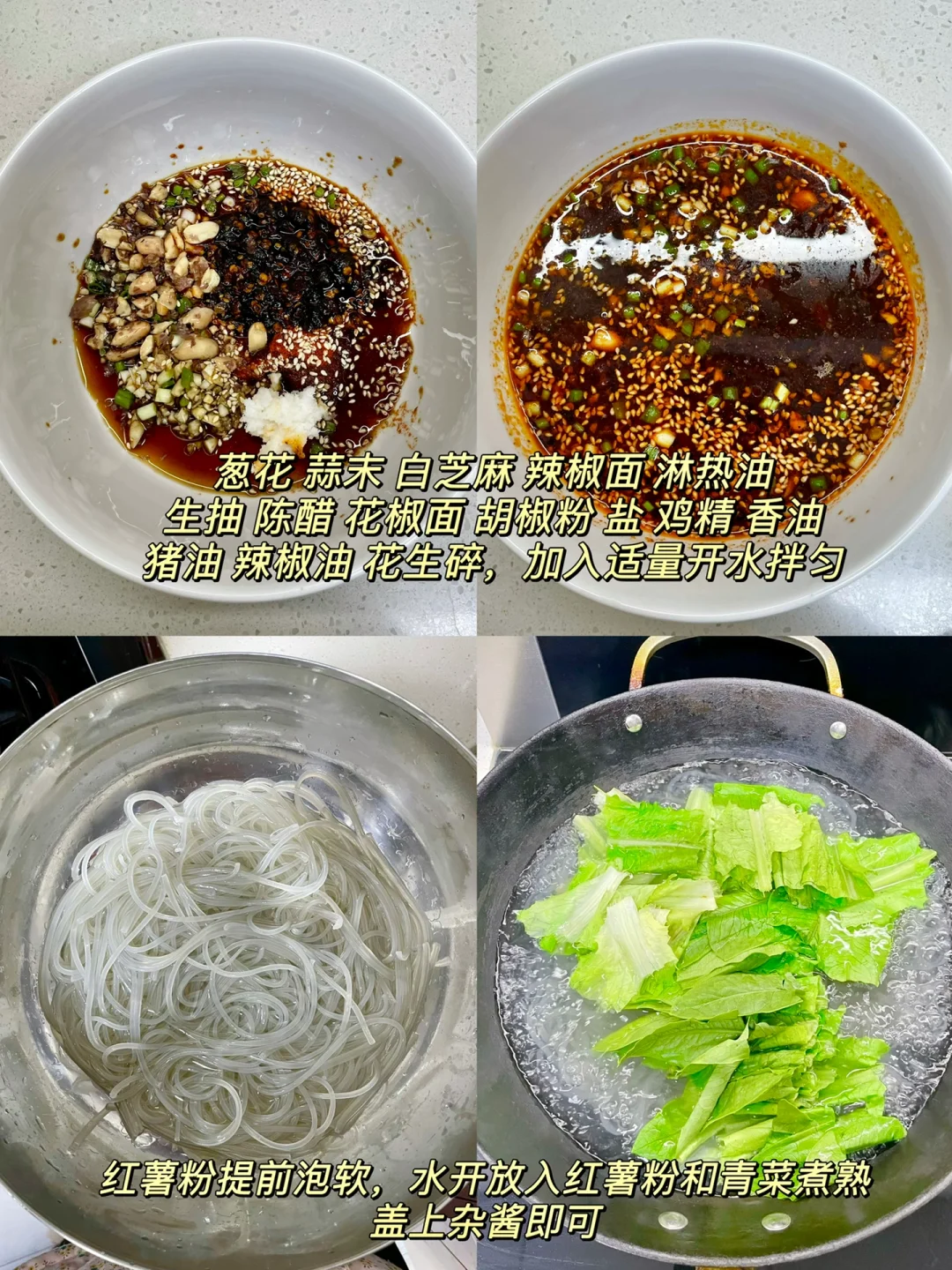 3⃣️:水开放入提前泡好的粉丝煮熟,再放入青菜烫熟捞出,加入杂酱即可