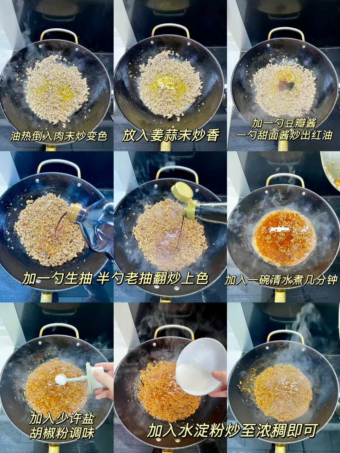 1⃣️:油热倒入肉末炒变色,放入姜蒜末炒香,加入一勺豆瓣酱 一勺甜面酱炒出红油,再加入一勺生抽 半勺老抽翻炒上色,加一碗水煮几分钟,加入少许盐和胡椒粉调味,再淋入一小碗水淀粉煮至浓稠