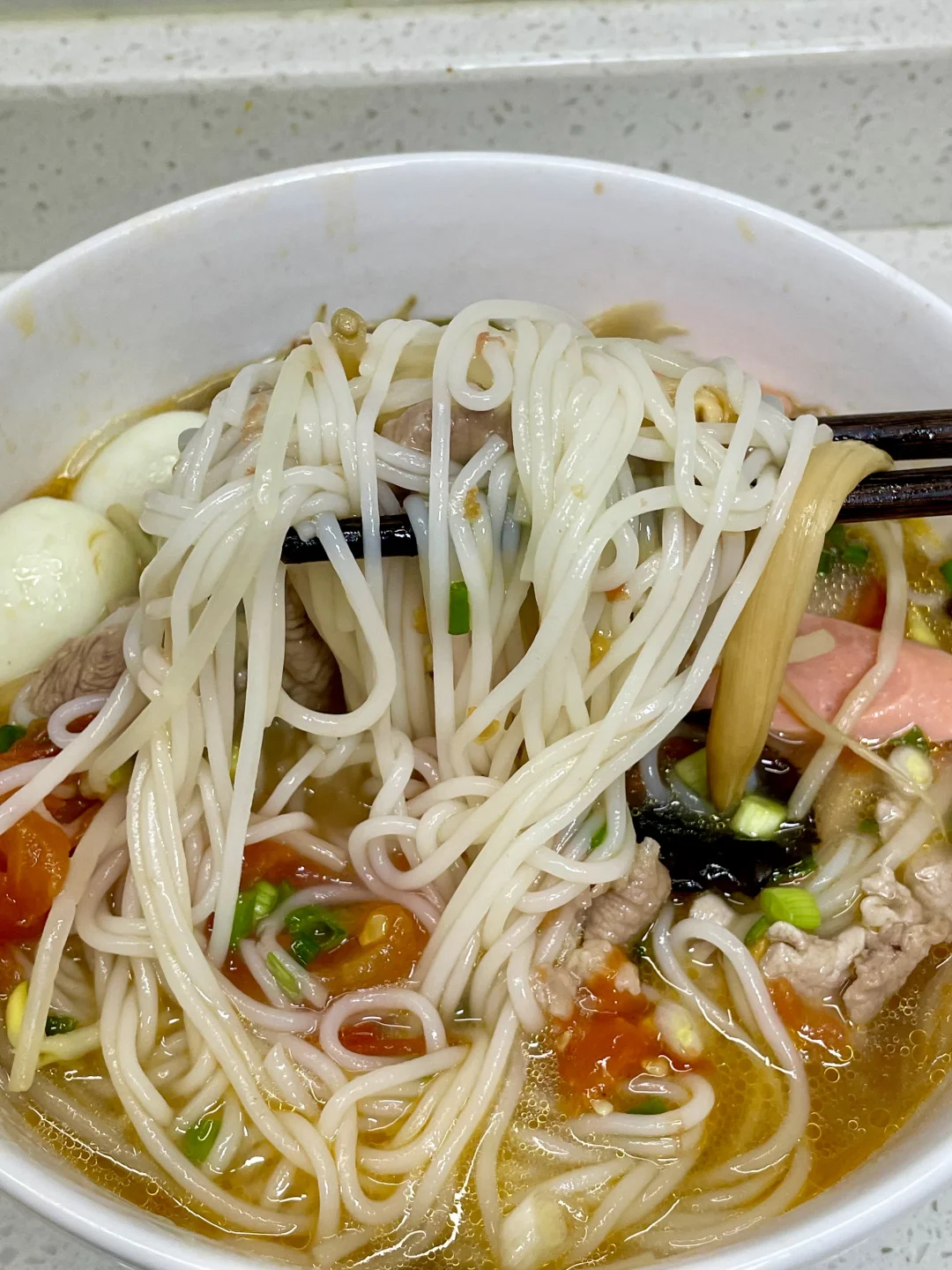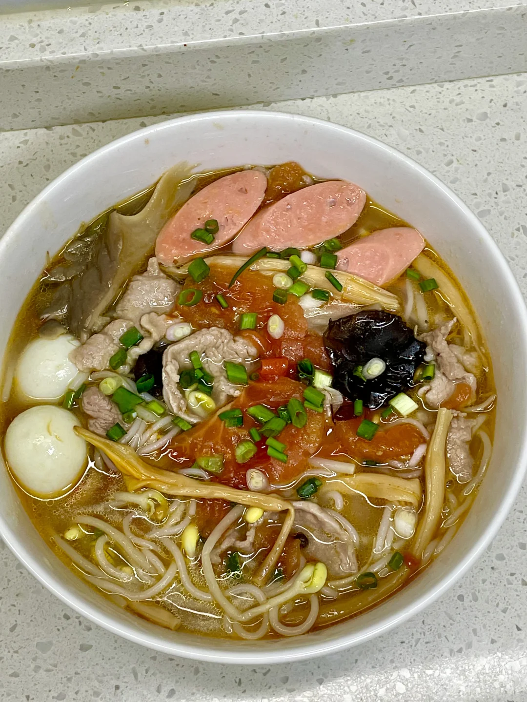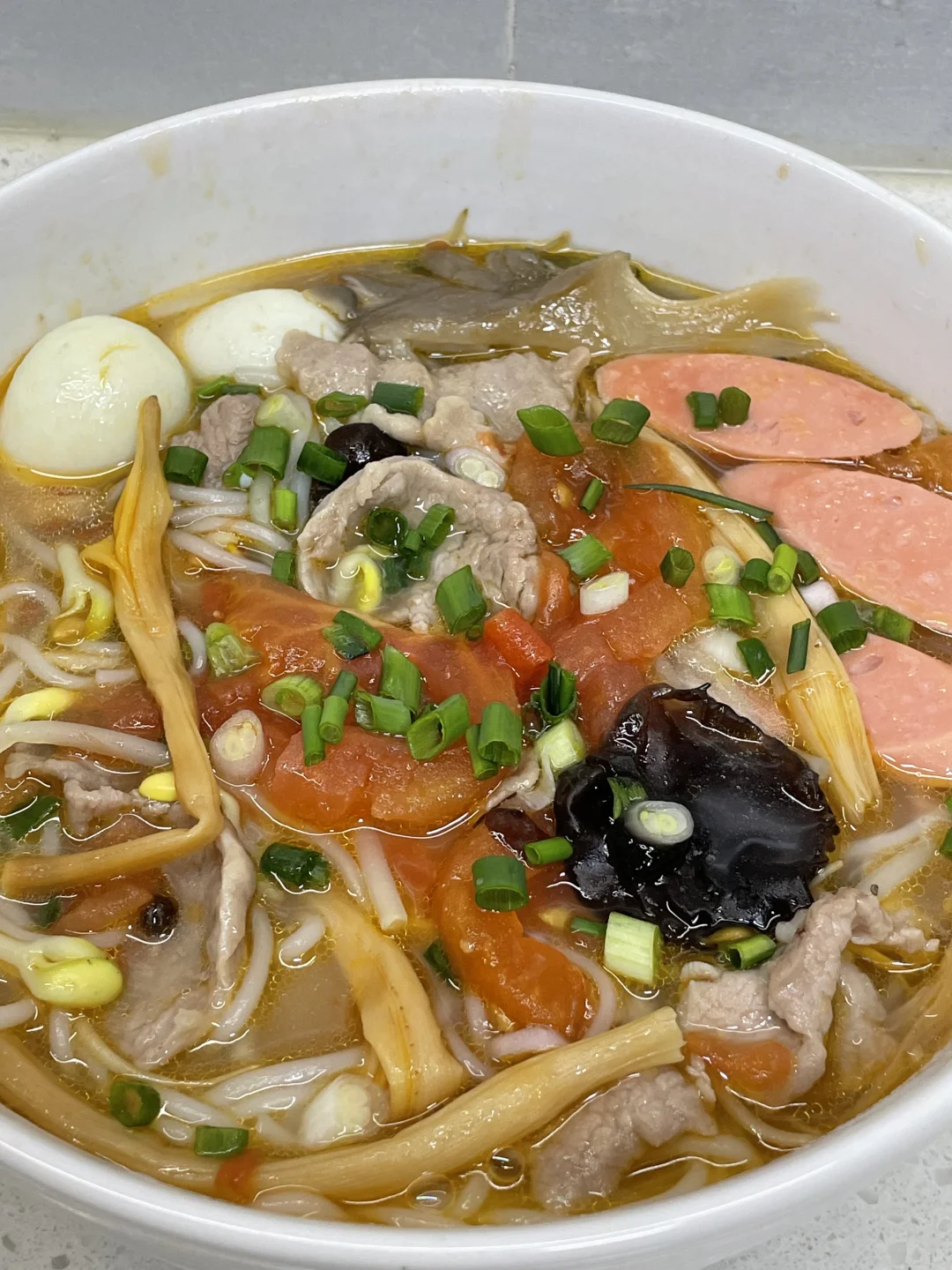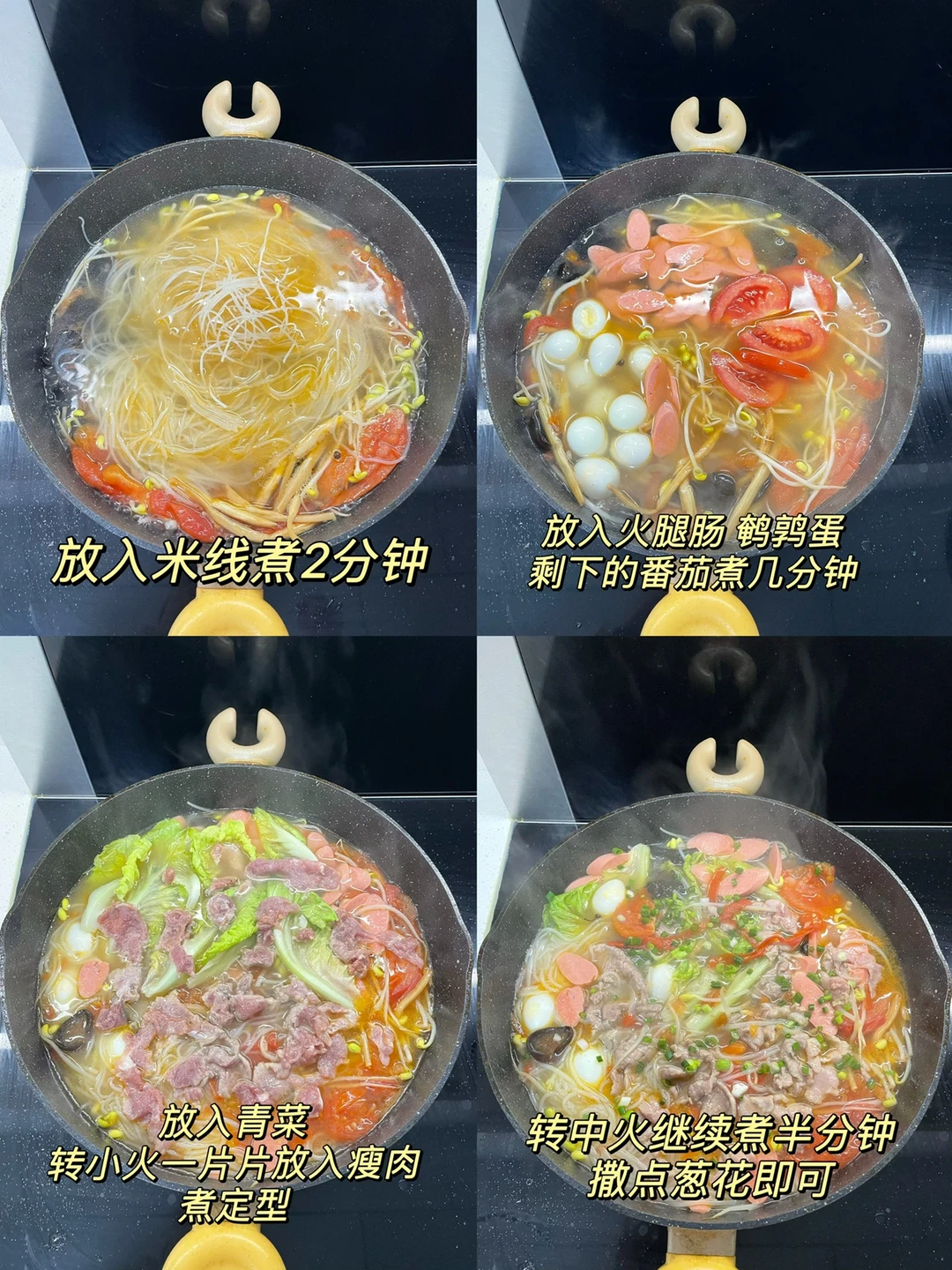 三鲜米线也太美味了吧,冬天来上一碗暖乎乎,汤汁都可以喝完[自拍R] 1⃣️:瘦肉切薄片,加入少许盐和淀粉抓匀,锅中油热倒入蒜末炒香,倒入二分之一番茄炒软,倒入适量开水,加盐 胡椒粉 鸡精调味 2⃣️:放入黄花 木耳 平菇 豆芽煮软,再放入米线煮2分钟,放入鹌鹑蛋 火腿肠 剩下的番茄继续煮几分钟 3⃣️:放入青菜,转小火放入瘦肉煮定型,再转中火煮半分钟,关火加入葱花即可