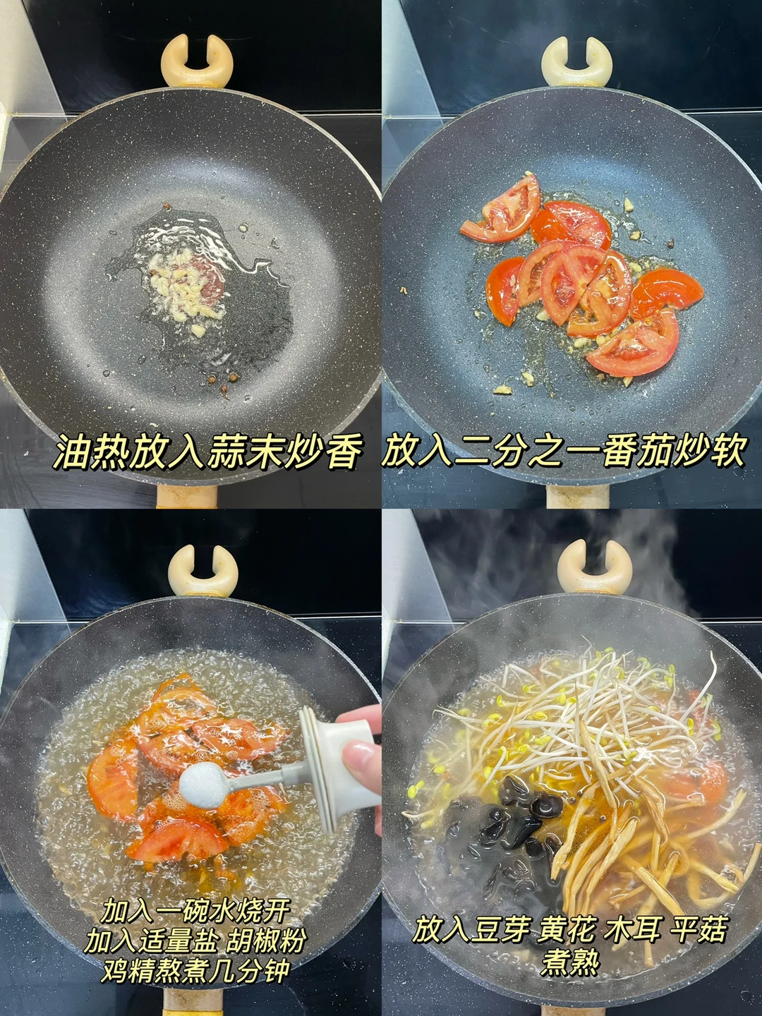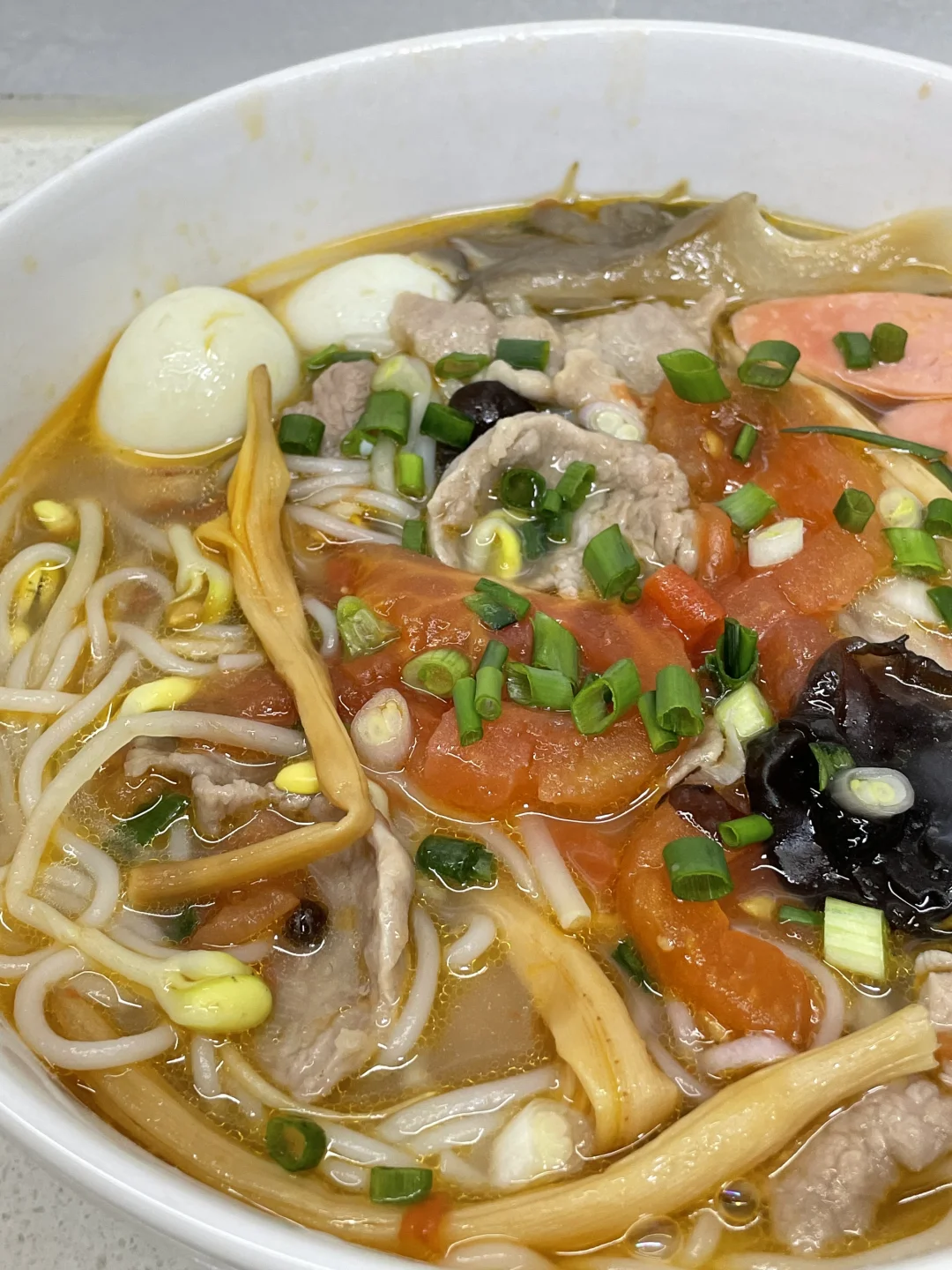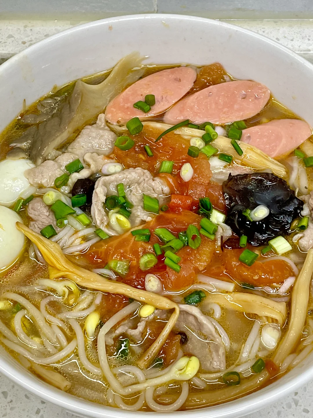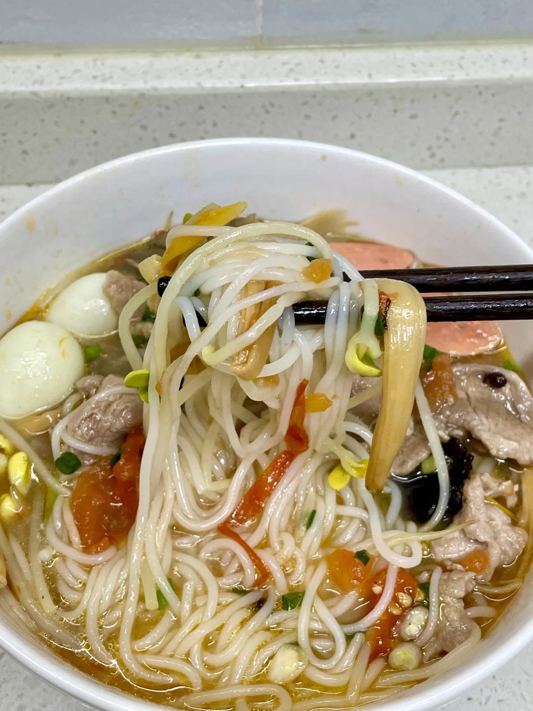 三鲜米线也太美味了吧,冬天来上一碗暖乎乎,汤汁都可以喝完[自拍R] 1⃣️:瘦肉切薄片,加入少许盐和淀粉抓匀,锅中油热倒入蒜末炒香,倒入二分之一番茄炒软,倒入适量开水,加盐 胡椒粉 鸡精调味 2⃣️:放入黄花 木耳 平菇 豆芽煮软,再放入米线煮2分钟,放入鹌鹑蛋 火腿肠 剩下的番茄继续煮几分钟 3⃣️:放入青菜,转小火放入瘦肉煮定型,再转中火煮半分钟,关火加入葱花即可