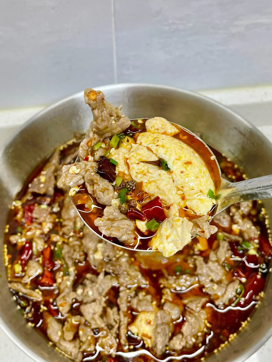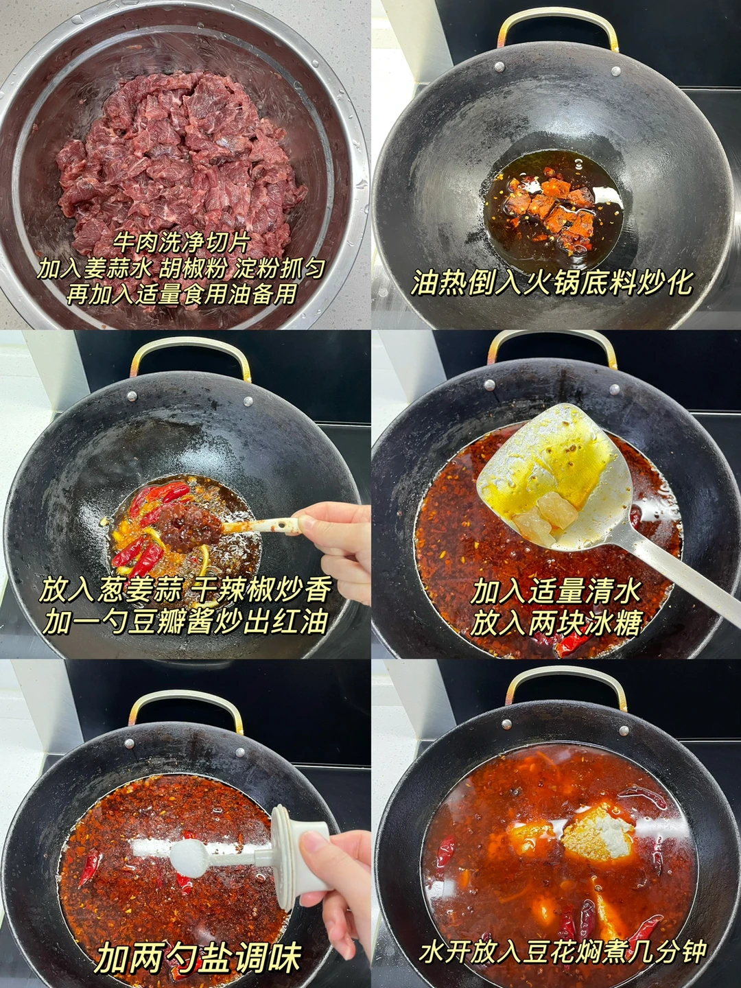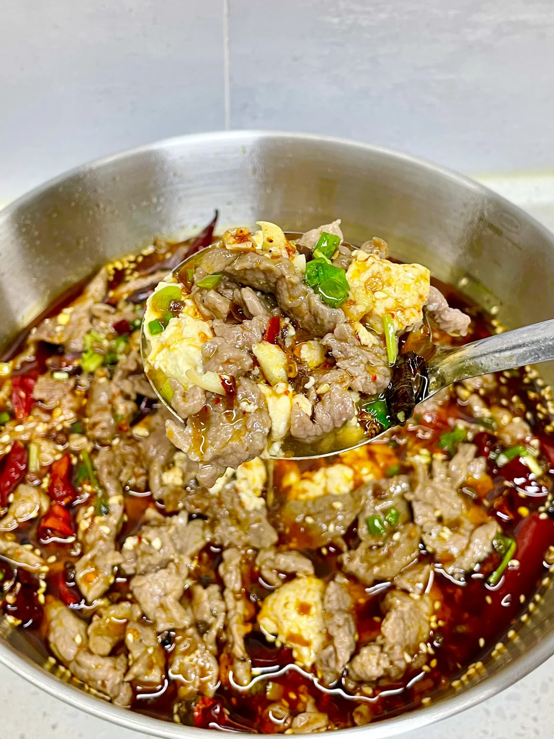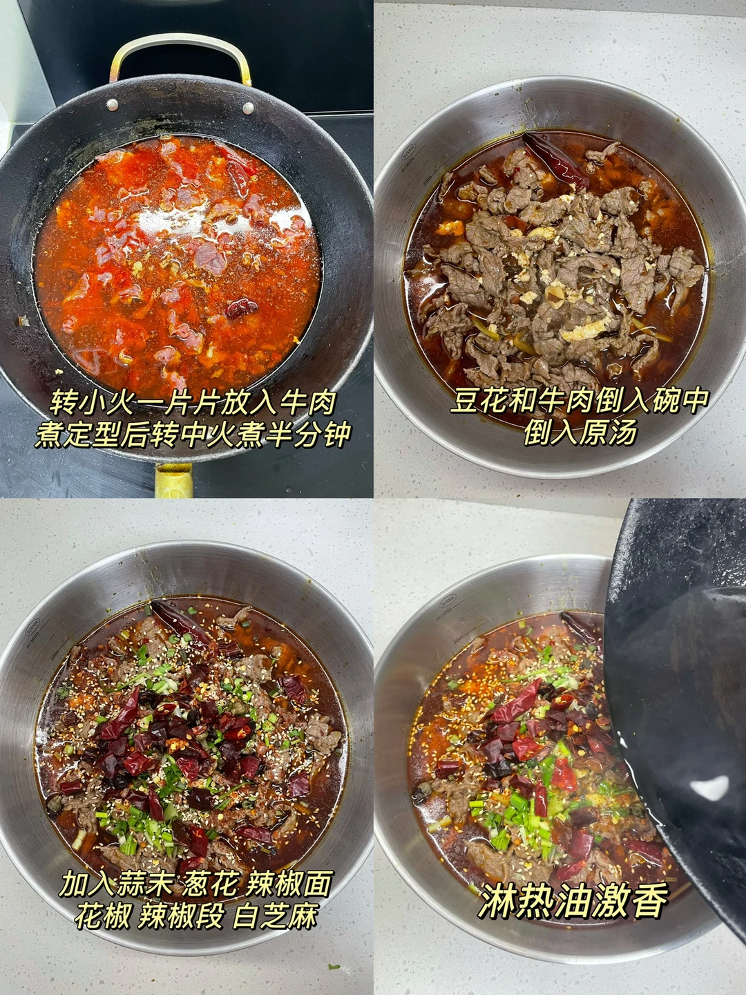 我做的豆花牛肉,家里人都爱吃,这道菜也算川菜扛把子之一了,就算放到年夜饭餐桌上也是很拿得出手的 1⃣️:牛肉洗净切薄片,加入姜蒜水 少许盐 胡椒粉 水淀粉抓匀,再加入适量食用油 2⃣️:锅中油热倒入火锅底料炒化,放入葱姜蒜 辣椒炒香,加一勺豆瓣酱炒出红油,加入适量清水,加两块儿冰糖提鲜,再加入两勺盐调味 3⃣️:水开放入豆花焖煮几分钟,转小火放入牛肉,煮定型后转中火煮半分钟捞出,倒入原汤,放入蒜末 葱花 白芝麻 花椒 辣椒段,淋热油激香
