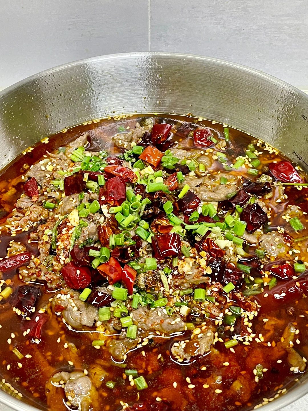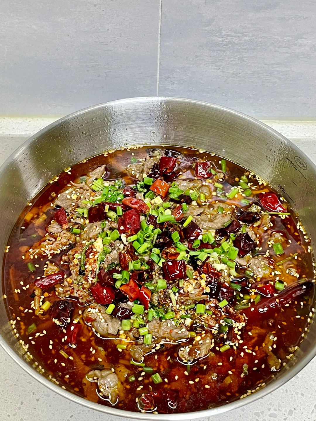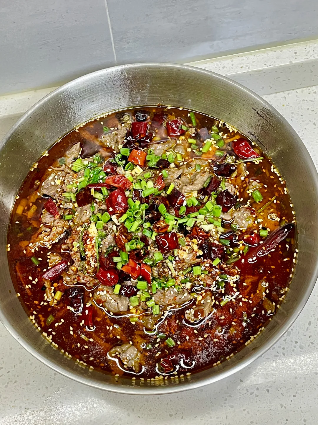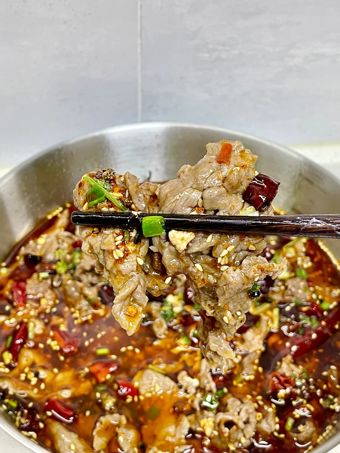 我做的豆花牛肉,家里人都爱吃,这道菜也算川菜扛把子之一了,就算放到年夜饭餐桌上也是很拿得出手的 1⃣️:牛肉洗净切薄片,加入姜蒜水 少许盐 胡椒粉 水淀粉抓匀,再加入适量食用油 2⃣️:锅中油热倒入火锅底料炒化,放入葱姜蒜 辣椒炒香,加一勺豆瓣酱炒出红油,加入适量清水,加两块儿冰糖提鲜,再加入两勺盐调味 3⃣️:水开放入豆花焖煮几分钟,转小火放入牛肉,煮定型后转中火煮半分钟捞出,倒入原汤,放入蒜末 葱花 白芝麻 花椒 辣椒段,淋热油激香