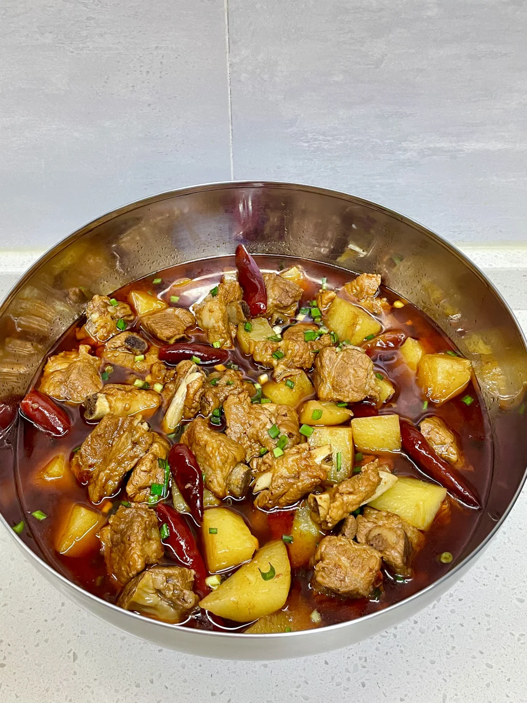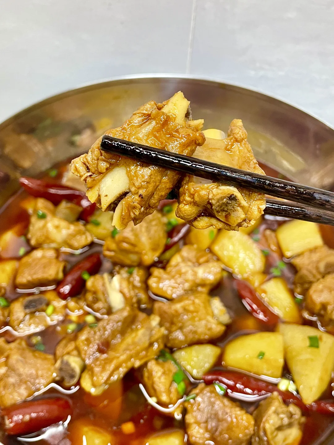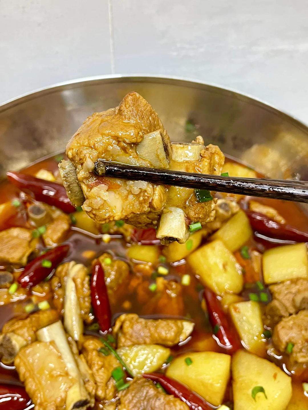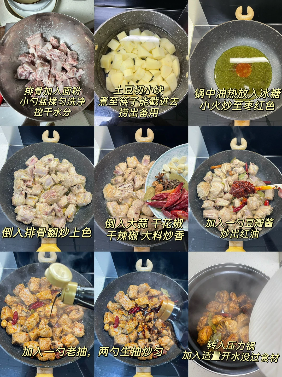 红烧排骨也太好吃了,汤汁浓郁,土豆软软糯糯,排骨软烂脱骨,一口一个停不下来[自拍R] 1⃣️:排骨加入面粉和少许盐反复揉洗干净控干水分,土豆切小块,加少许盐煮至筷子能戳穿捞出备用 2⃣️:锅中油热放入冰糖,小火慢炒至枣红色,倒入排骨翻炒上色,倒入干花椒 干辣椒 大蒜和大料炒香,加一勺豆瓣酱炒出红油,加一勺老抽 两勺生抽炒匀 3⃣️:转入电压力锅,加入开水没过食材,加入适量盐和胡椒粉炖煮30分钟,倒入锅中收汁,放入土豆继续煮几分钟,加少许鸡精调味,关火加入葱花即可