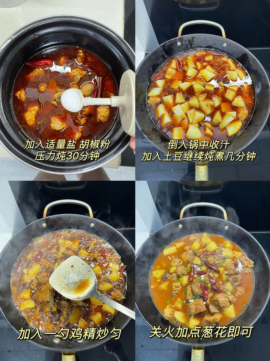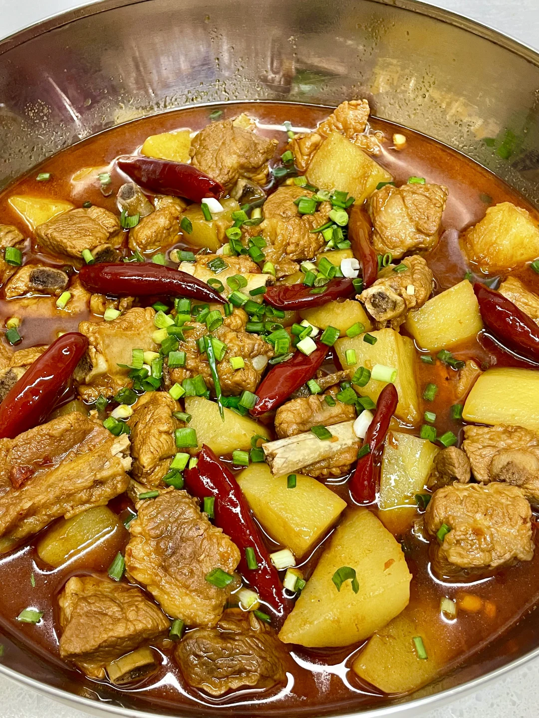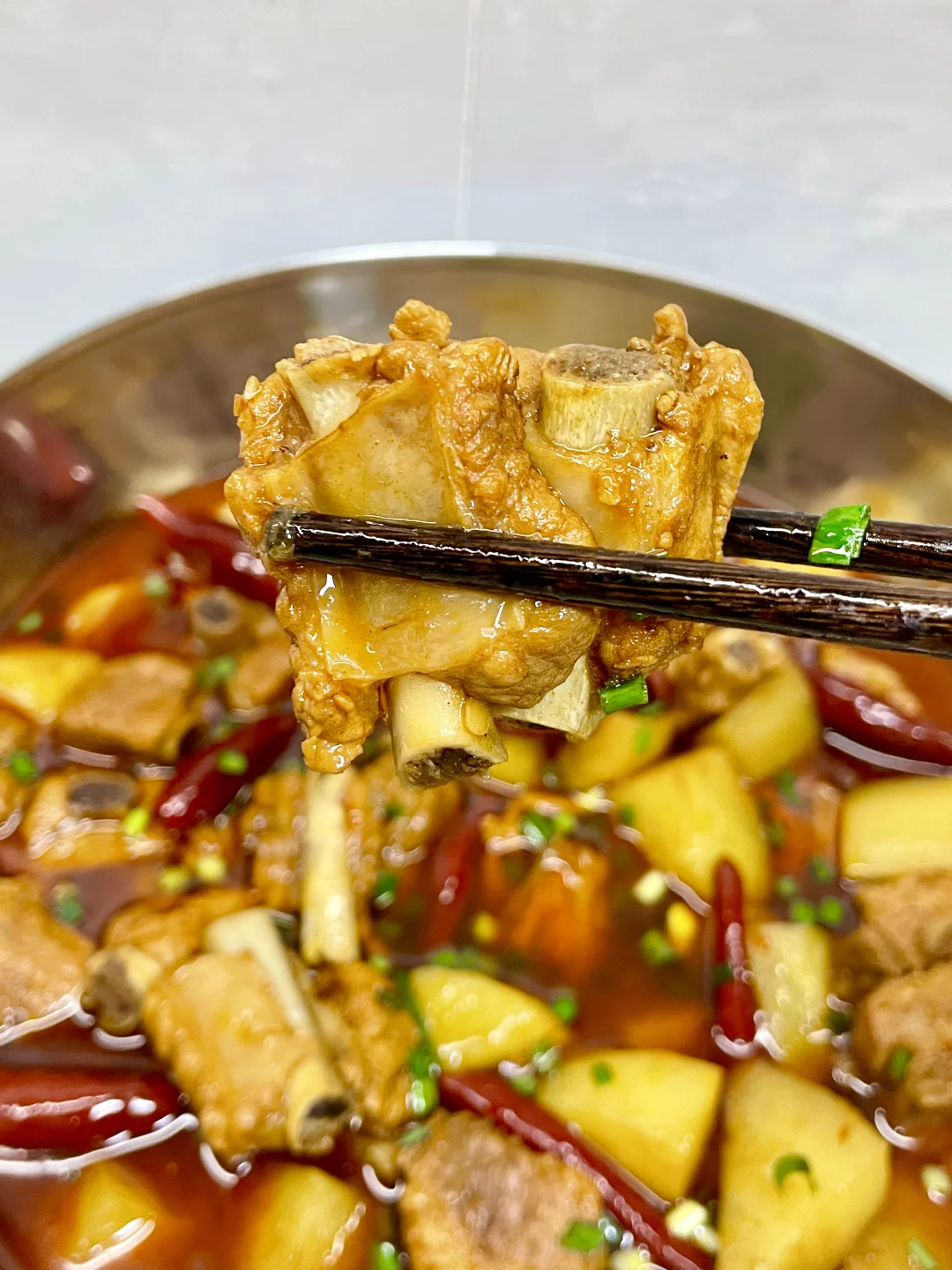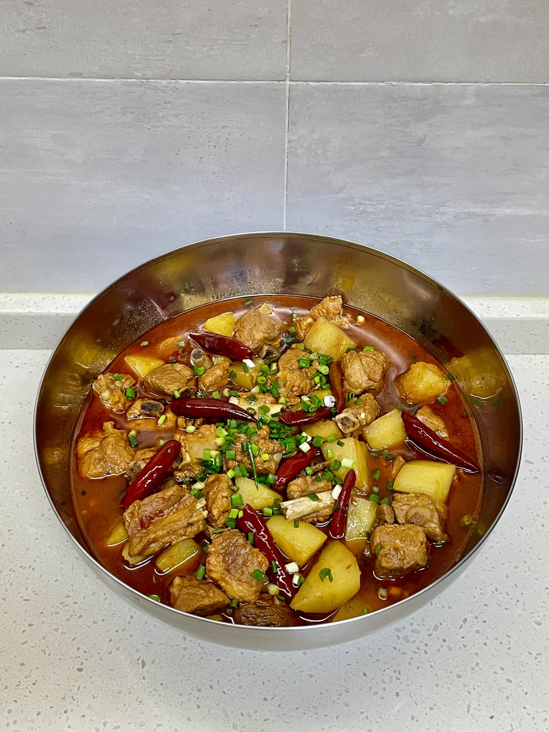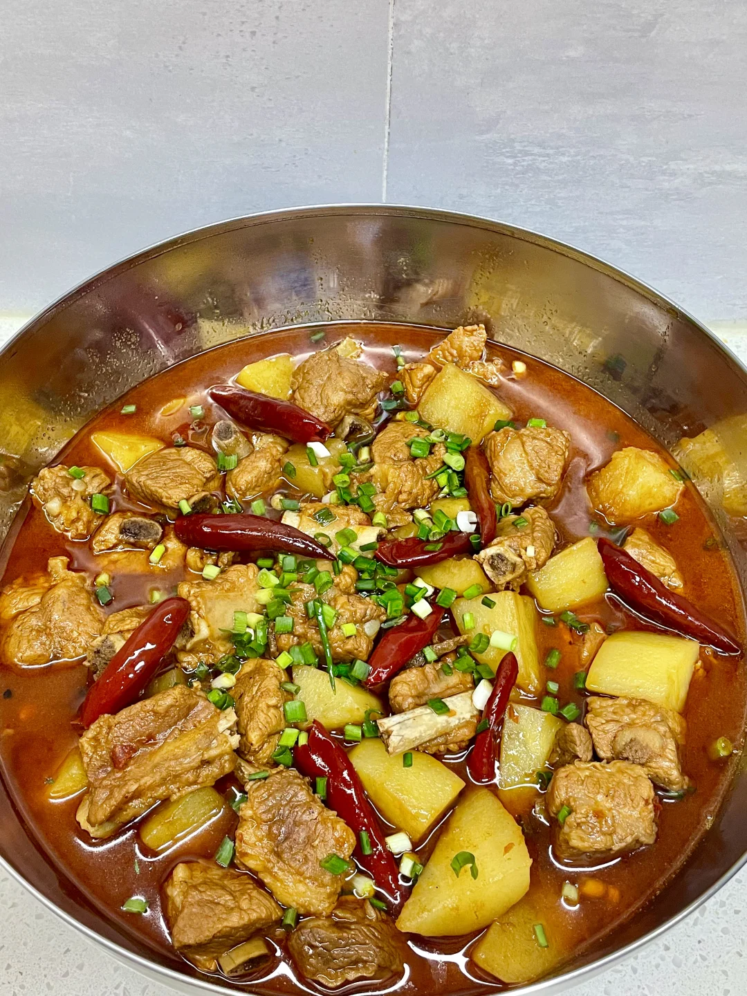 红烧排骨也太好吃了,汤汁浓郁,土豆软软糯糯,排骨软烂脱骨,一口一个停不下来[自拍R] 1⃣️:排骨加入面粉和少许盐反复揉洗干净控干水分,土豆切小块,加少许盐煮至筷子能戳穿捞出备用 2⃣️:锅中油热放入冰糖,小火慢炒至枣红色,倒入排骨翻炒上色,倒入干花椒 干辣椒 大蒜和大料炒香,加一勺豆瓣酱炒出红油,加一勺老抽 两勺生抽炒匀 3⃣️:转入电压力锅,加入开水没过食材,加入适量盐和胡椒粉炖煮30分钟,倒入锅中收汁,放入土豆继续煮几分钟,加少许鸡精调味,关火加入葱花即可