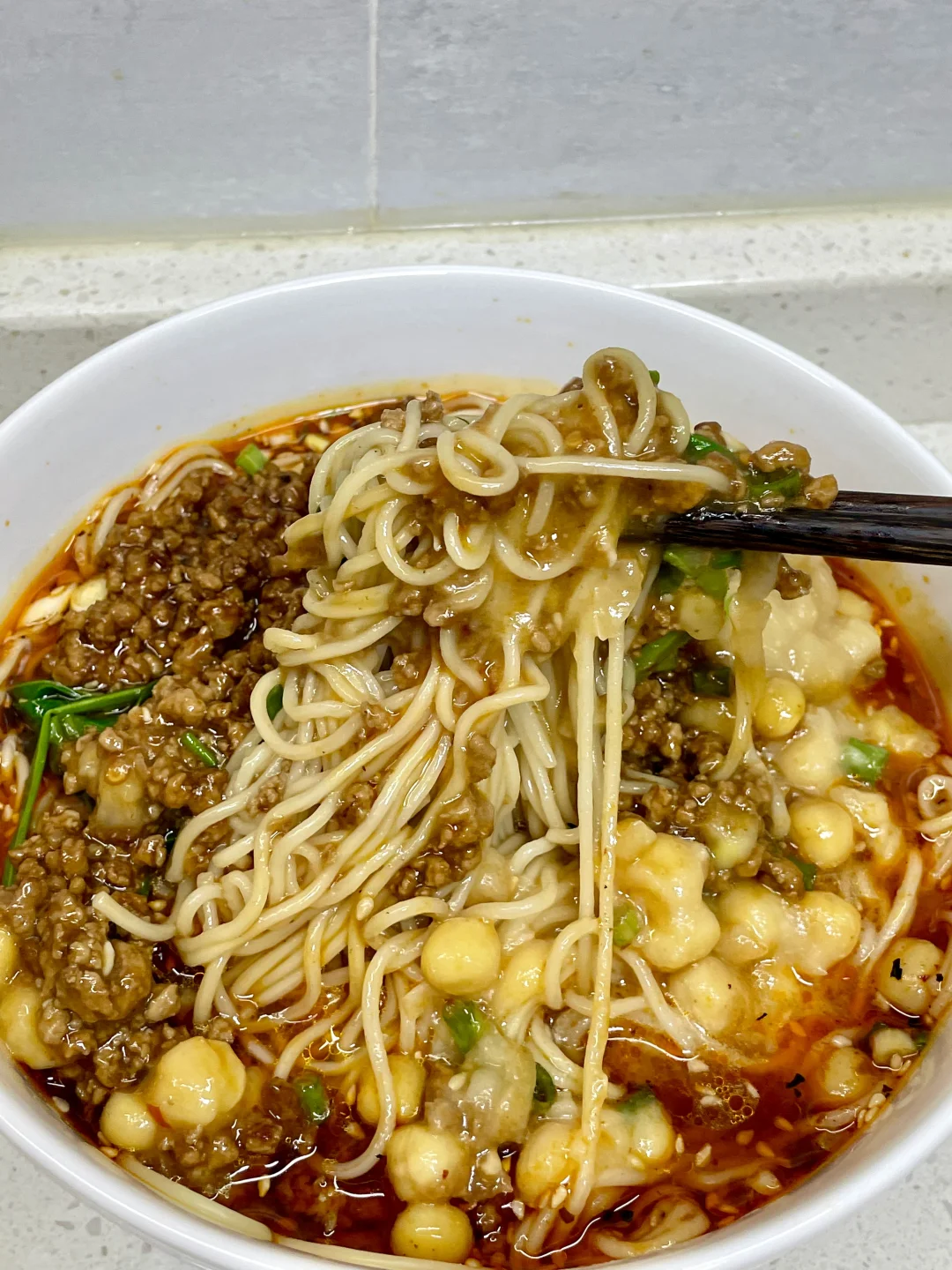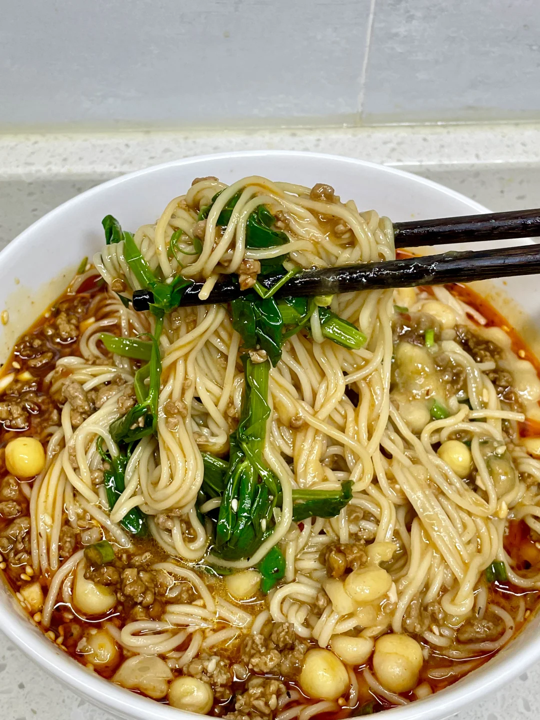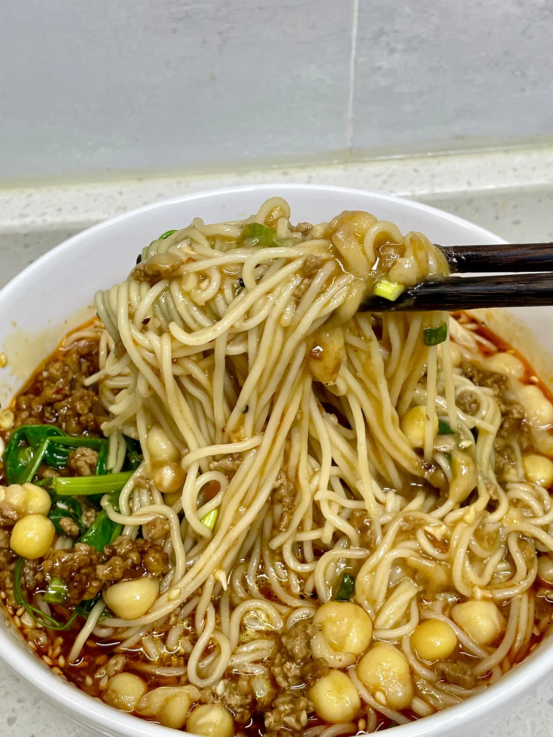 料超足的豌豆杂酱面,成功复刻了面馆的味道,豌豆软烂翻沙,裹满了面条,再加上一勺杂酱,简直不要太爽