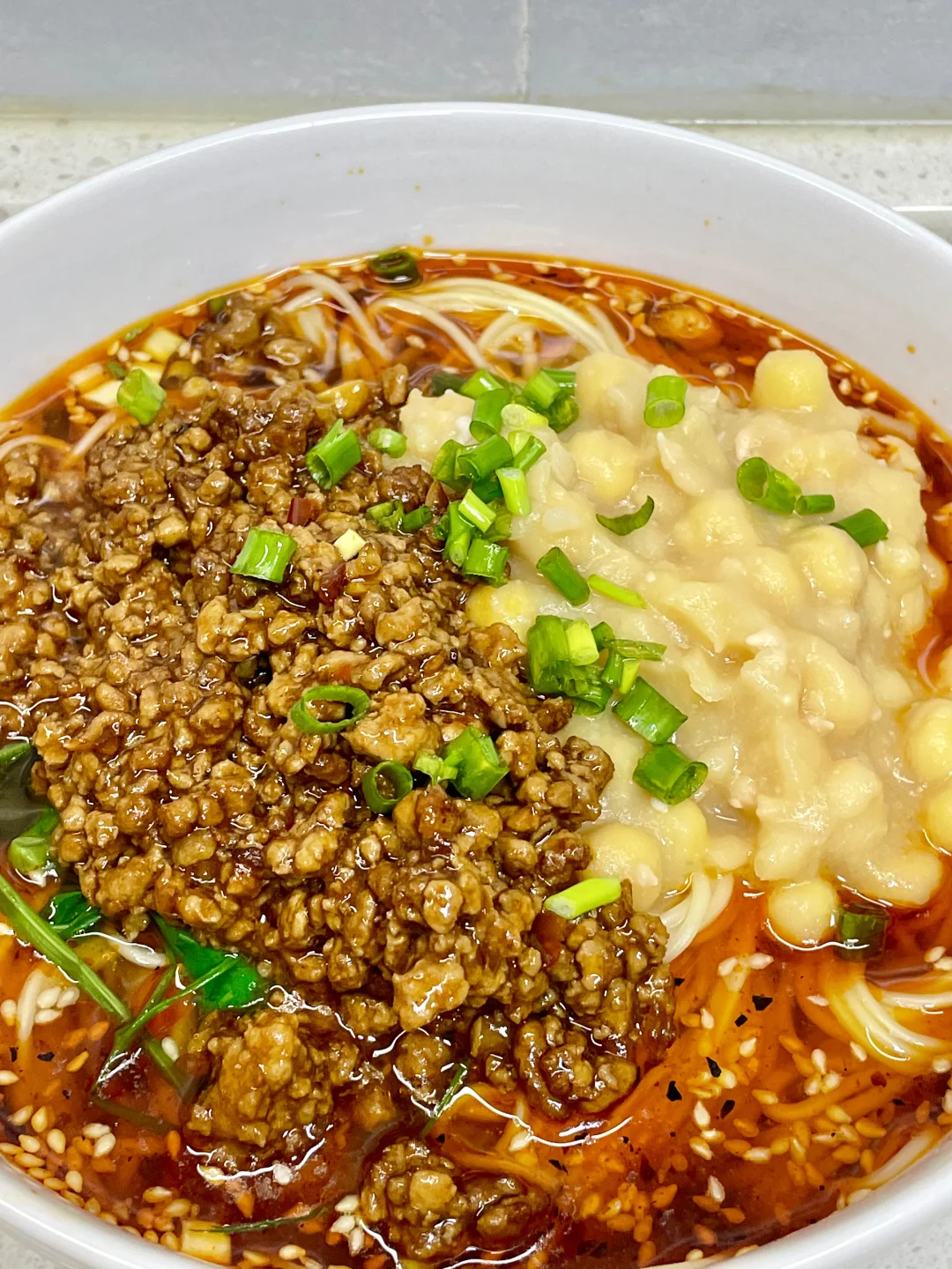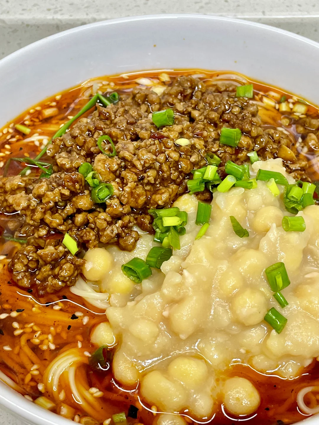 3⃣️佐料:碗中加葱蒜末 白芝麻 辣椒面淋热油,生抽 陈醋适量 少许胡椒粉 胡椒面 猪油 香油 一勺辣椒油,再加入面汤,水开放入面条煮熟,放入豌豆尖烫熟捞出,加入豌豆和杂酱即可