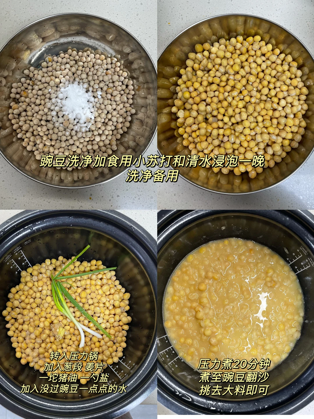 1⃣️豌豆:豌豆洗净,加小苏打 提前一晚上泡水 豌豆洗净 加一勺猪油 姜片 大葱段 一勺盐 电压力锅炖20分钟