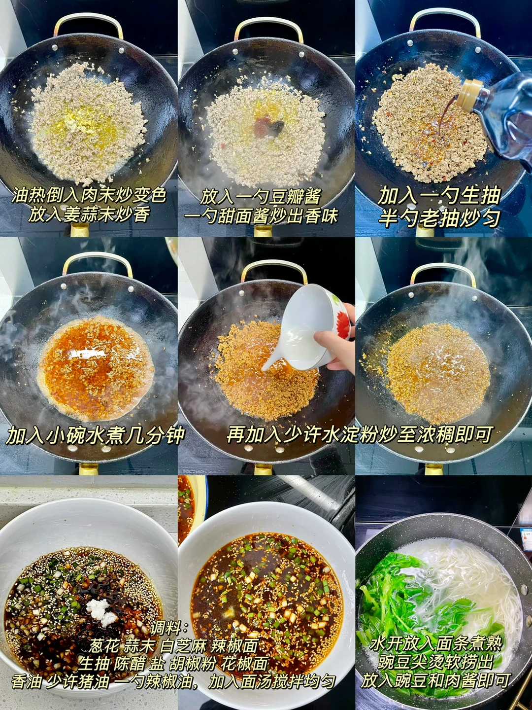 2⃣️杂酱:油热倒入肉末炒散,加入姜蒜末炒香,加入一勺豆瓣酱 一勺甜面酱炒出红油,加入一勺生抽 半勺老抽炒匀,加入一小碗水煮几分钟,再加入少许水淀粉煮至浓稠即可