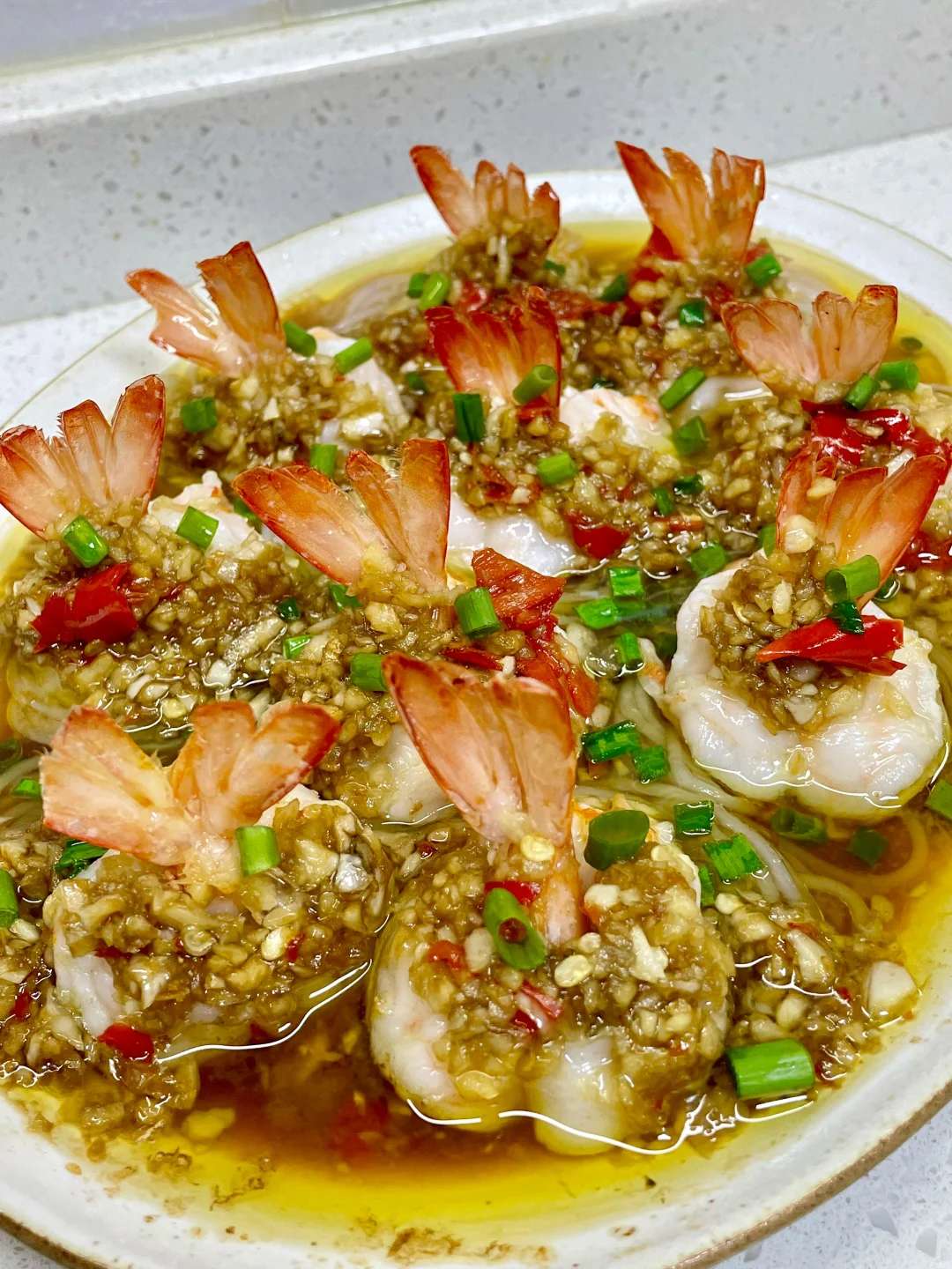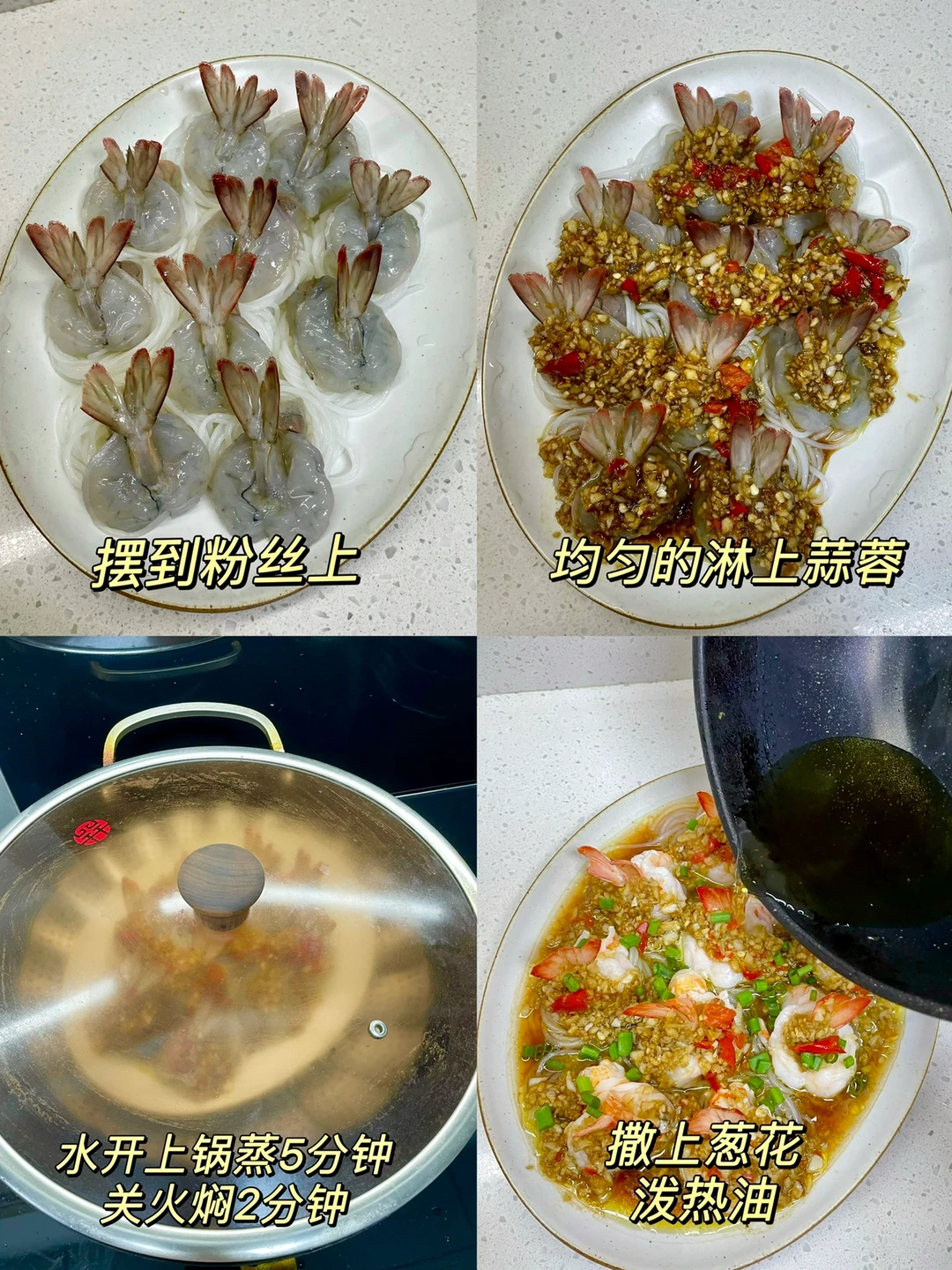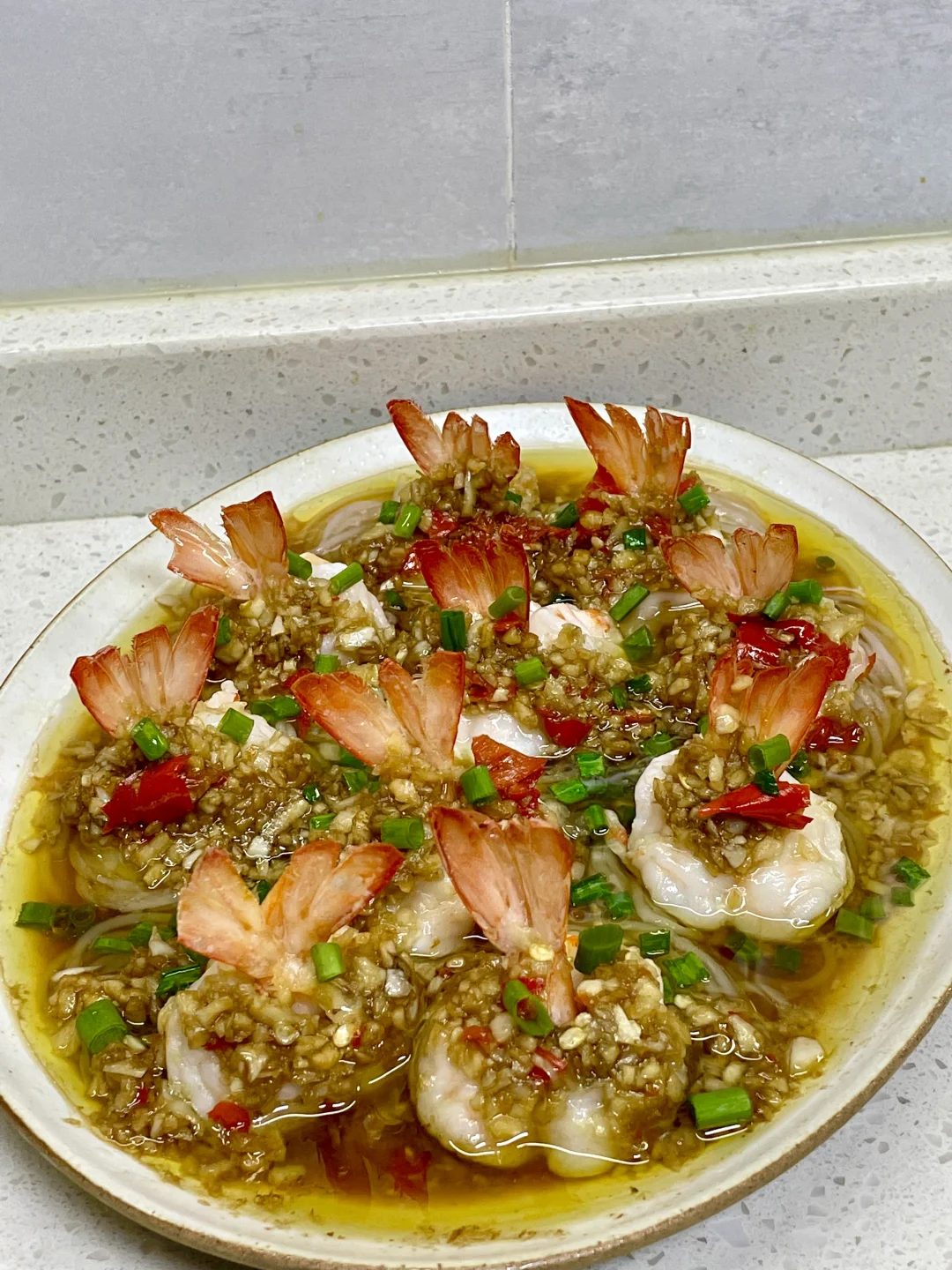 蒜蓉粉丝虾来了,一道很简单的硬菜,粉丝缠绕着虾寓意腰缠万贯,虾尾开出了花型寓意花开富贵,虾肉粉嫩,粉丝入味,颜值与口感并存,一定要试试[派对R] 1⃣️:准备蒜蓉酱,大蒜10瓣左右+2个小米辣打成蒜蓉放入碗中,泼热油激香,再加入两勺生抽 小勺盐 一勺蚝油和白糖拌匀 2⃣️:一个粉丝提前泡软,绕成环状摆入盘中,虾去头去壳去虾线留虾尾,开背后中间剪一个小孔,虾尾从小孔中穿过摆好造型 3⃣️:虾一个个摆到粉丝上,均匀的淋上蒜蓉酱,水开上锅蒸5分钟,关火焖2分钟,撒上葱花,泼热油即可