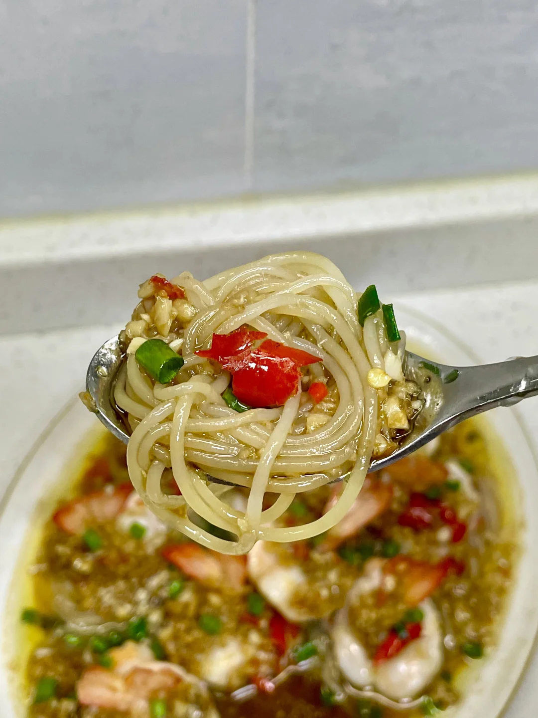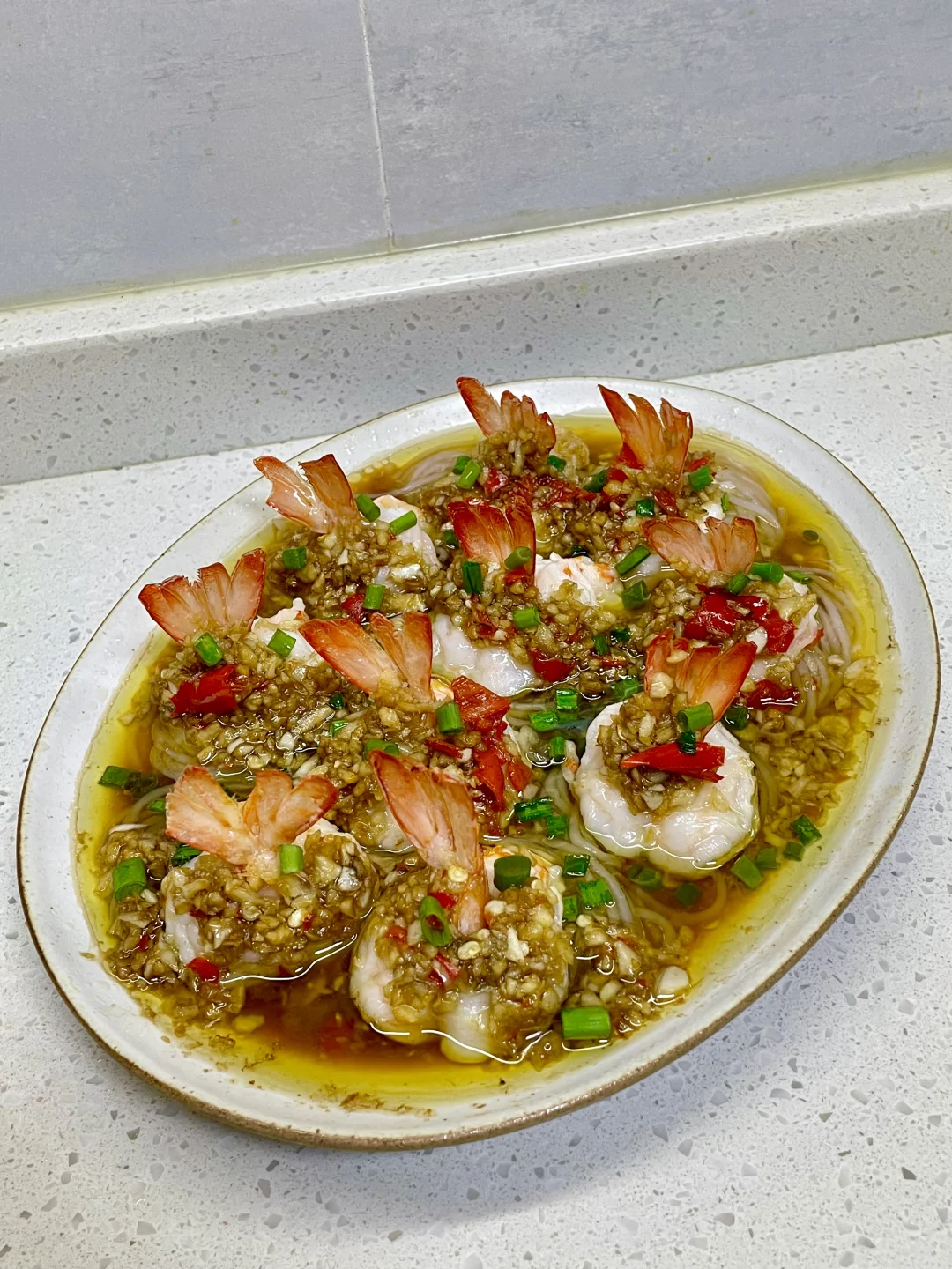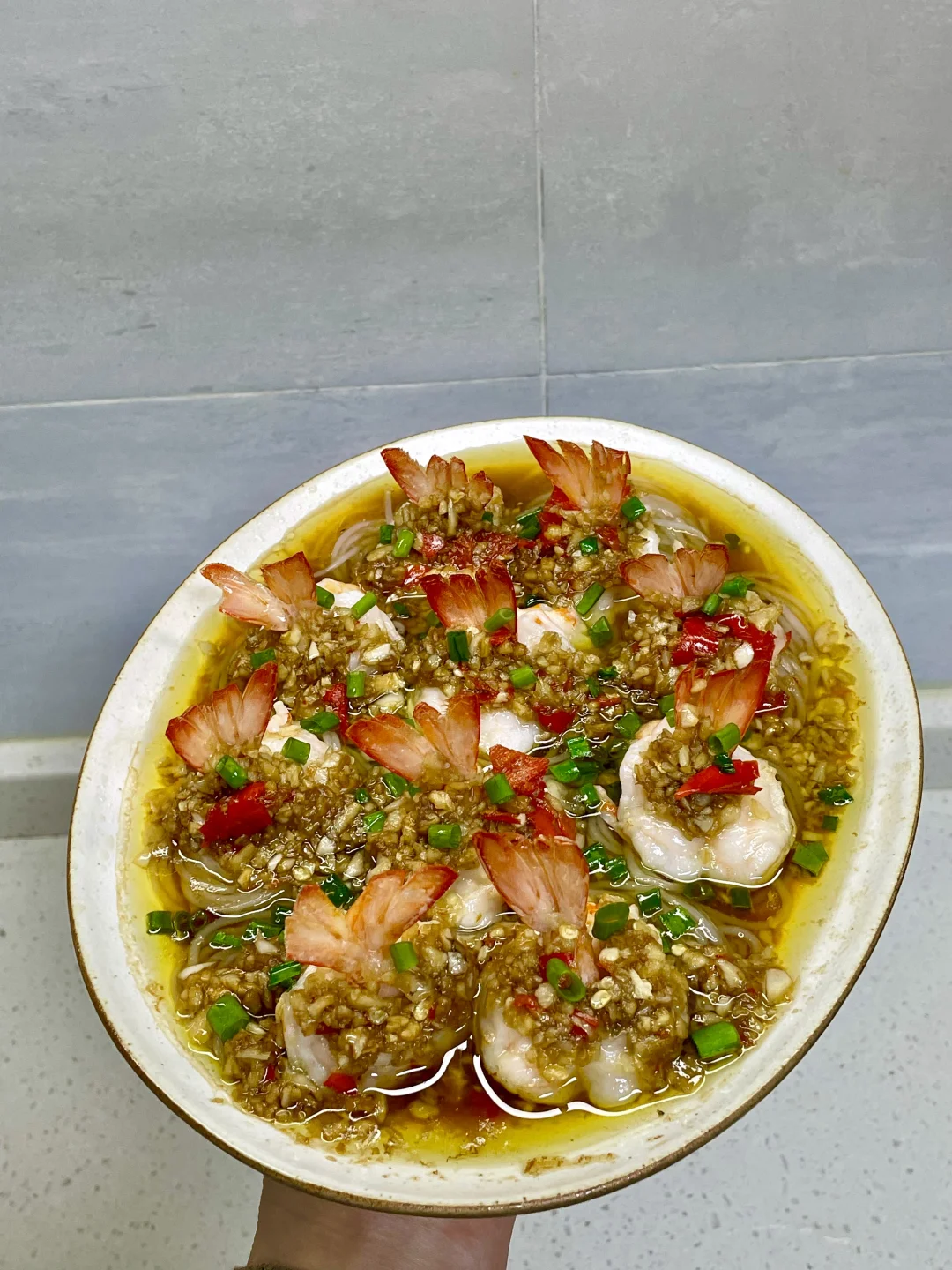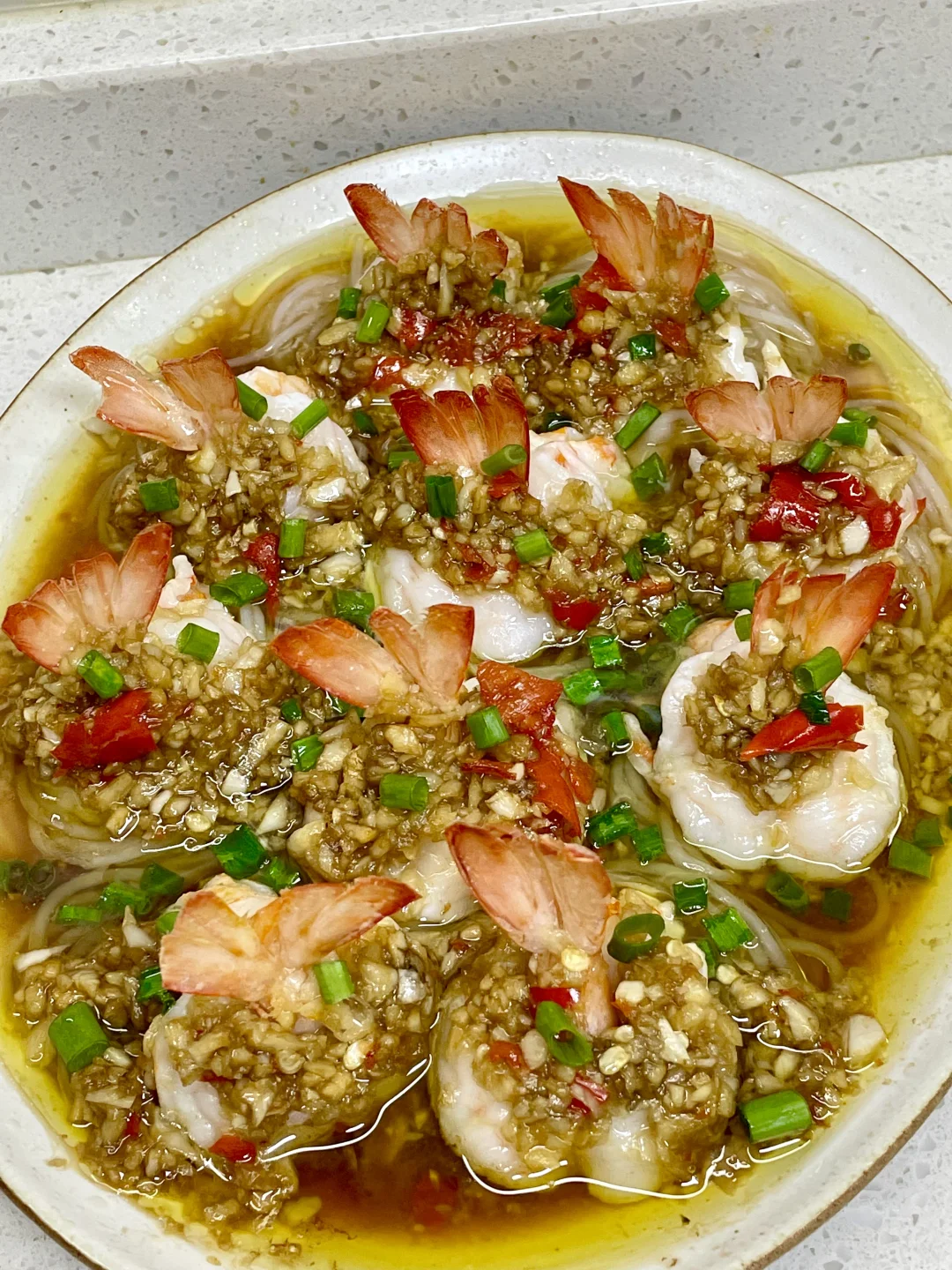 蒜蓉粉丝虾来了,一道很简单的硬菜,粉丝缠绕着虾寓意腰缠万贯,虾尾开出了花型寓意花开富贵,虾肉粉嫩,粉丝入味,颜值与口感并存,一定要试试[派对R] 1⃣️:准备蒜蓉酱,大蒜10瓣左右+2个小米辣打成蒜蓉放入碗中,泼热油激香,再加入两勺生抽 小勺盐 一勺蚝油和白糖拌匀 2⃣️:一个粉丝提前泡软,绕成环状摆入盘中,虾去头去壳去虾线留虾尾,开背后中间剪一个小孔,虾尾从小孔中穿过摆好造型 3⃣️:虾一个个摆到粉丝上,均匀的淋上蒜蓉酱,水开上锅蒸5分钟,关火焖2分钟,撒上葱花,泼热油即可