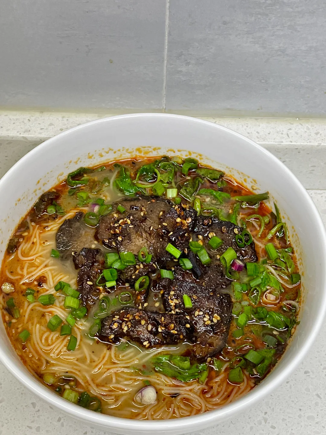 2⃣️:锅中烧水,水开放入面饼,再放入调味包,再放入青菜煮软出锅,盖上炒好的牛肉,撒点葱花即可