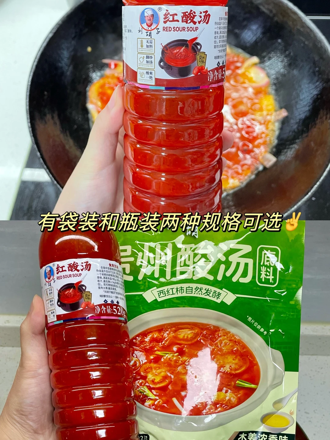 刘胡子酸汤底料采用的是优质番茄发酵,袋装的不用炒制,直接倒进去就行,瓶装的炒个一分钟左右即可,非常的方便,可以加入自己喜欢的任意配菜,做酸汤鱼 酸汤面之类的杠杠滴,有多种口味,选择更多哦