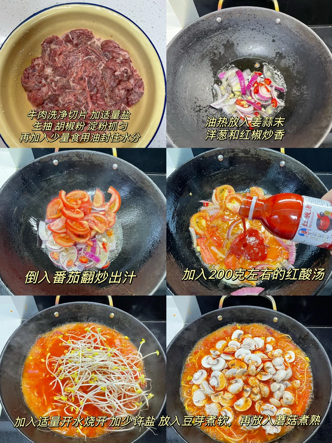 2⃣️:锅中油热倒入姜蒜末 洋葱和红椒炒香,再倒入番茄块翻炒出汁,倒入200克左右的红酸汤翻炒一分钟左右