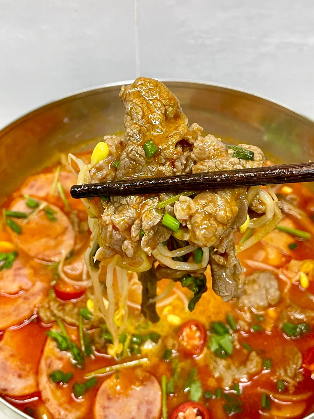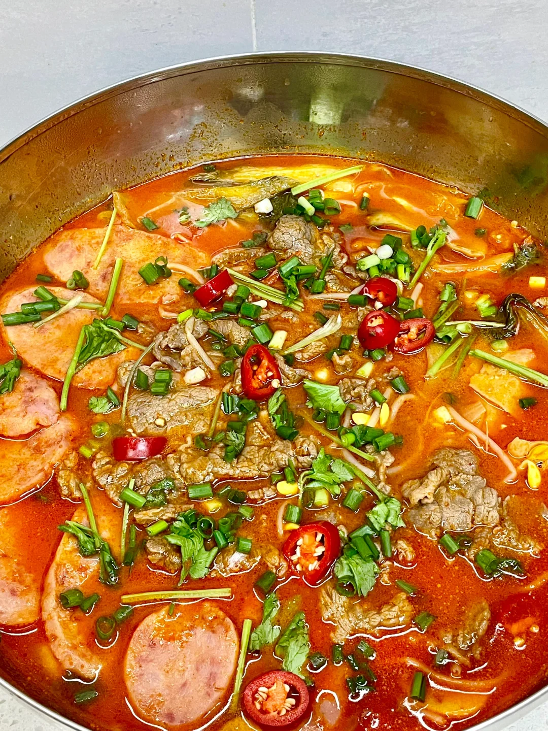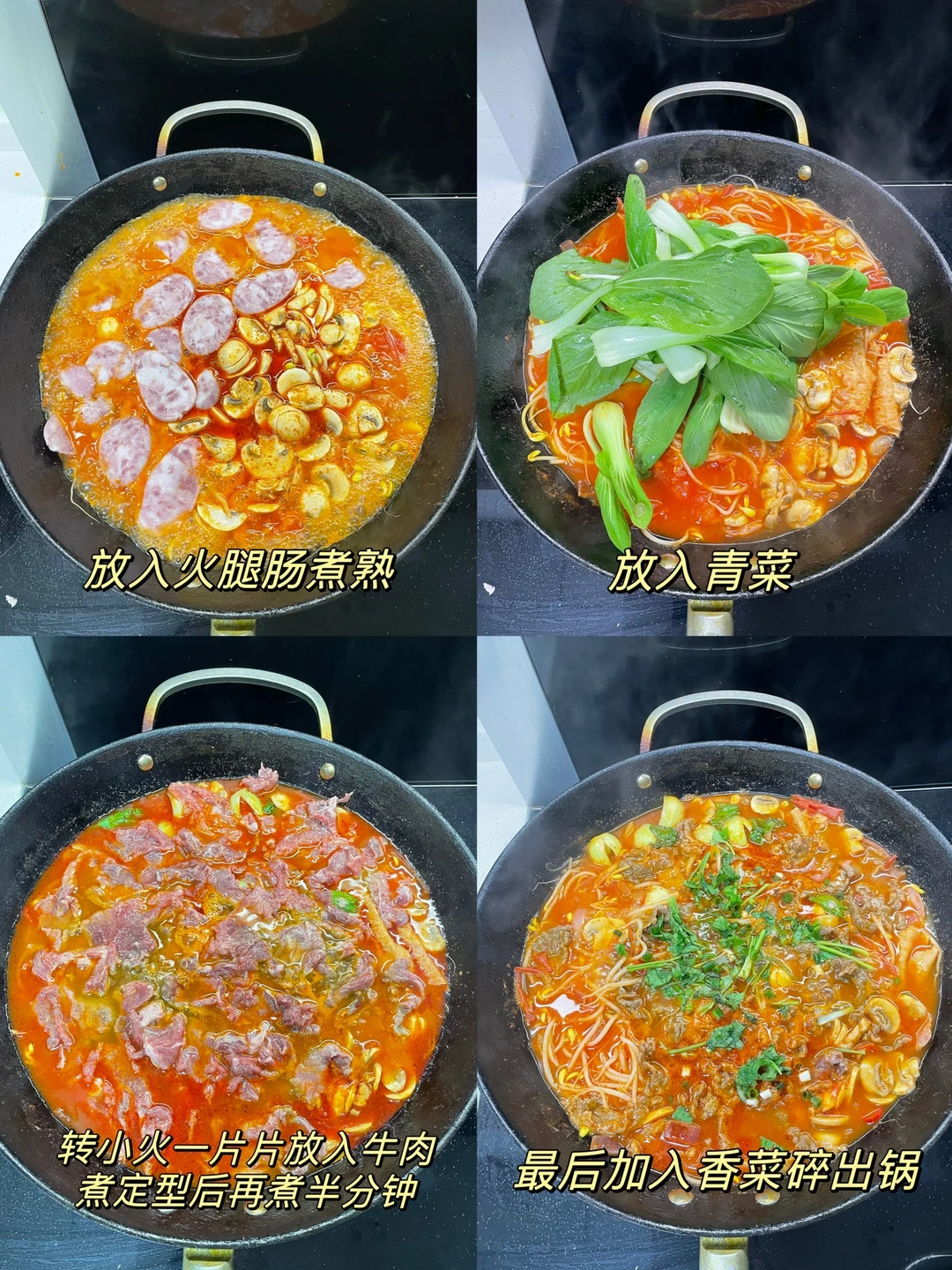 3⃣️:加入适量开水烧开,加少许盐调味,再放入豆芽 蘑菇 火腿肠 青菜煮软,转小火一片片放入牛肉,煮定型再煮半分钟,起锅前加入香菜碎即可