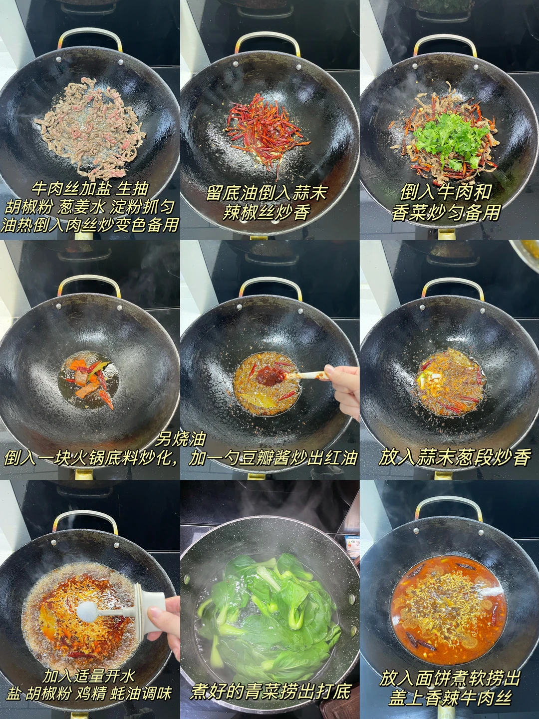 香辣牛肉丝配上火锅面也太过瘾了,辣上加辣,重庆胃也太满足了,快来试试吧 1⃣️:牛肉丝加入盐 生抽 胡椒粉 淀粉 葱姜水抓匀,锅中油热倒入牛肉丝炒变色备用 2⃣️:留底油倒入蒜末 辣椒丝炒香,倒入牛肉丝炒匀,再加入香菜炒匀即可 3⃣️:另起锅烧油,油热倒入火锅底料炒化,加一勺豆瓣酱炒出红油,放入蒜末葱段炒香,加入适量开水烧开,加适量盐 胡椒粉 鸡精 蚝油调味,再放入面饼煮熟,清水煮好的青菜捞出打底,放入面条和原汤,盖上香辣牛肉丝即可