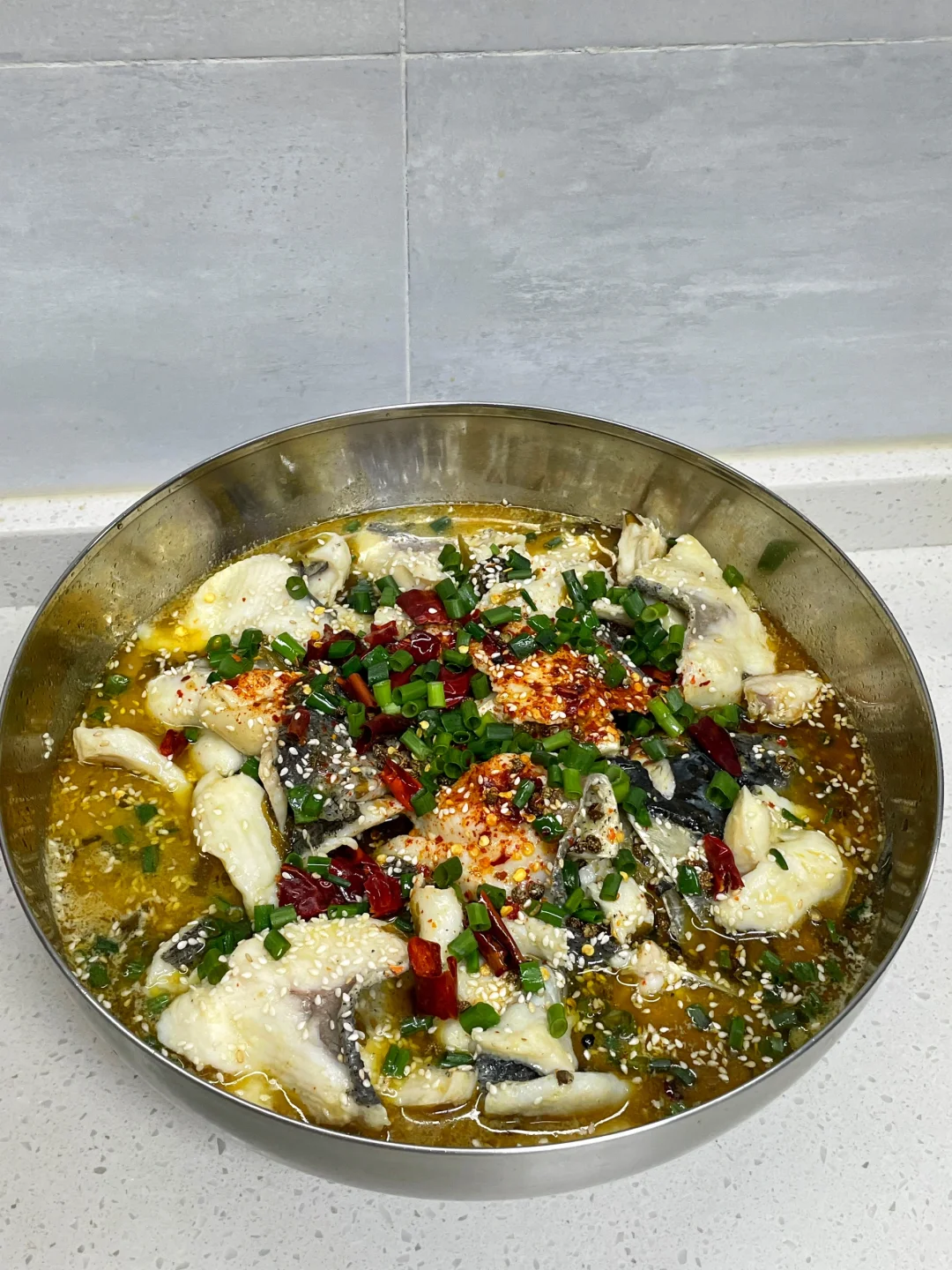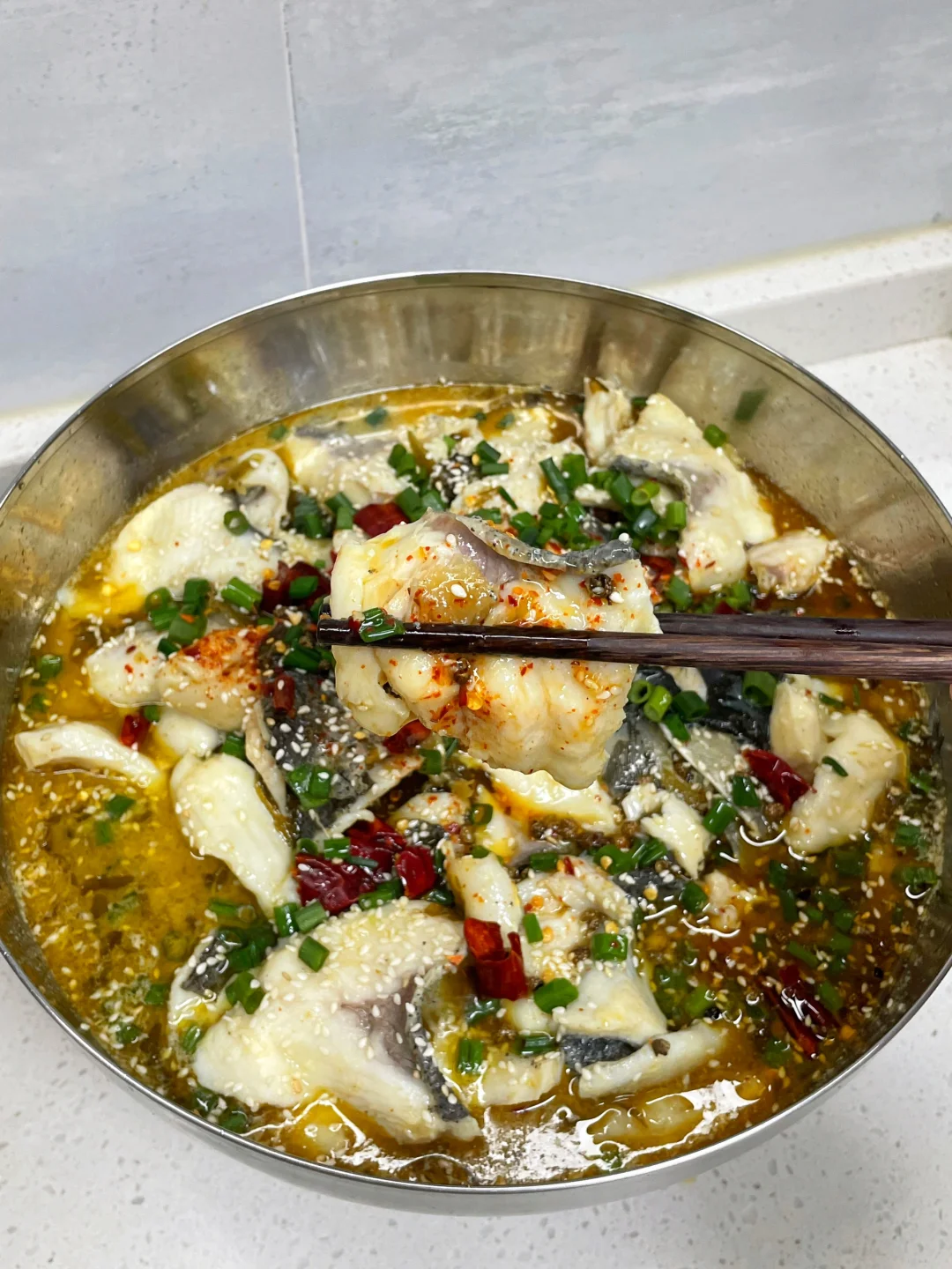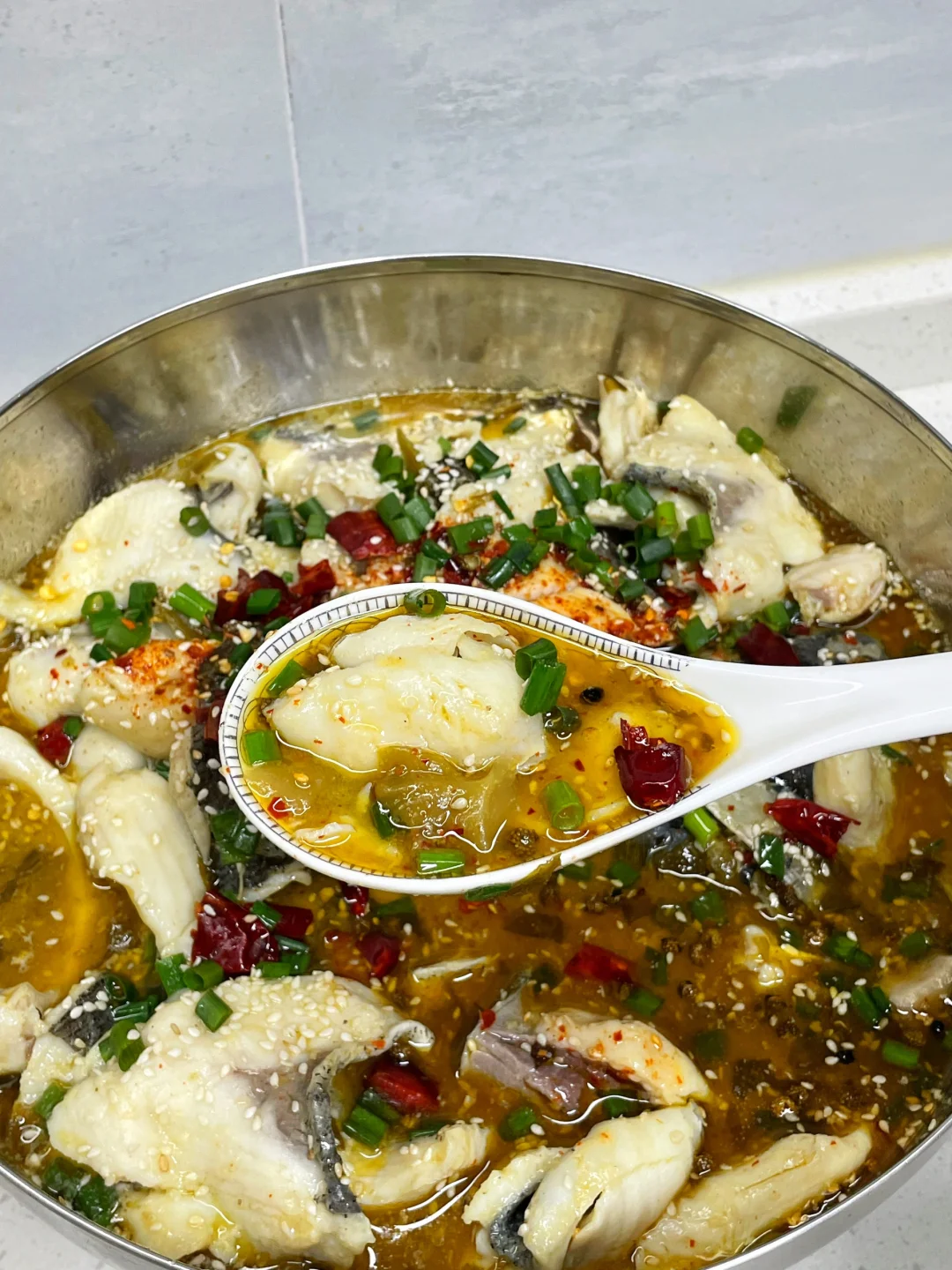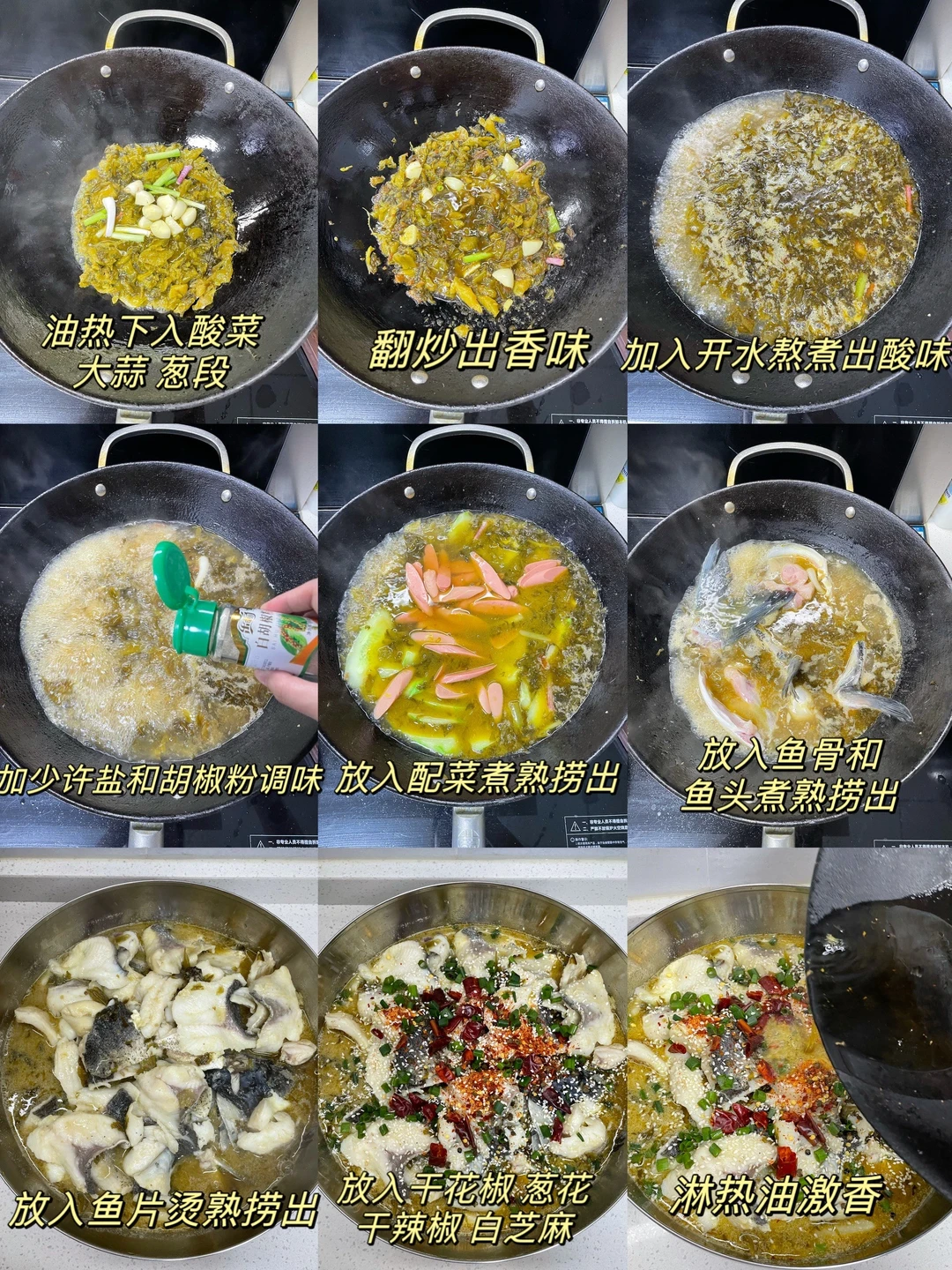 超级好吃的酸菜鱼,开胃解腻巨下饭,汤汁直接可以泡两碗饭吃 1⃣️:鱼肉洗净控干水分,加两勺盐 少许料酒 蛋清 适量淀粉抓匀腌制半小时 2⃣️:锅中油热倒入酸菜 大蒜 葱段炒香,加入开水熬煮出酸味,加少许盐和胡椒粉调味,再放入配菜煮熟捞出打底 3⃣️:放入鱼骨和鱼头煮熟捞出用,再放入鱼片烫熟捞出,碗中放入干花椒干辣椒 葱花白芝麻和少许辣椒慢,淋热油激香即可