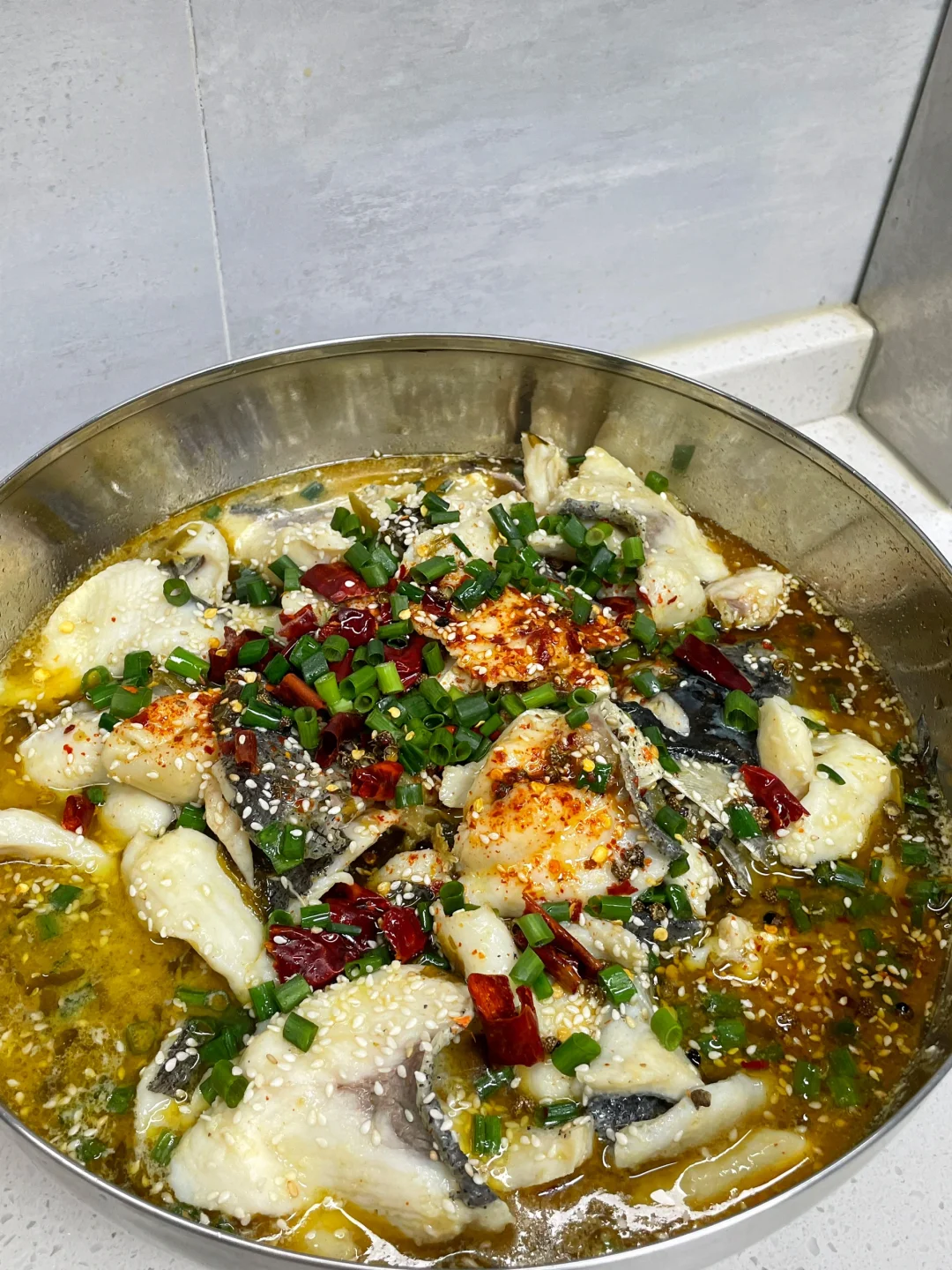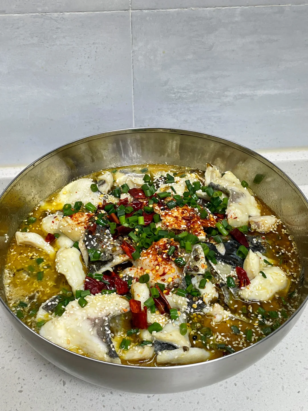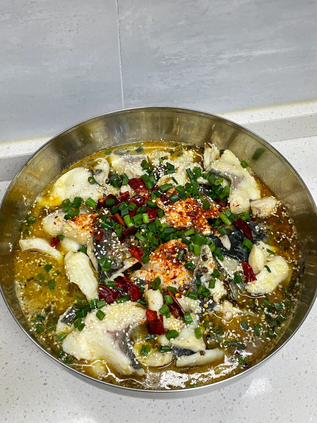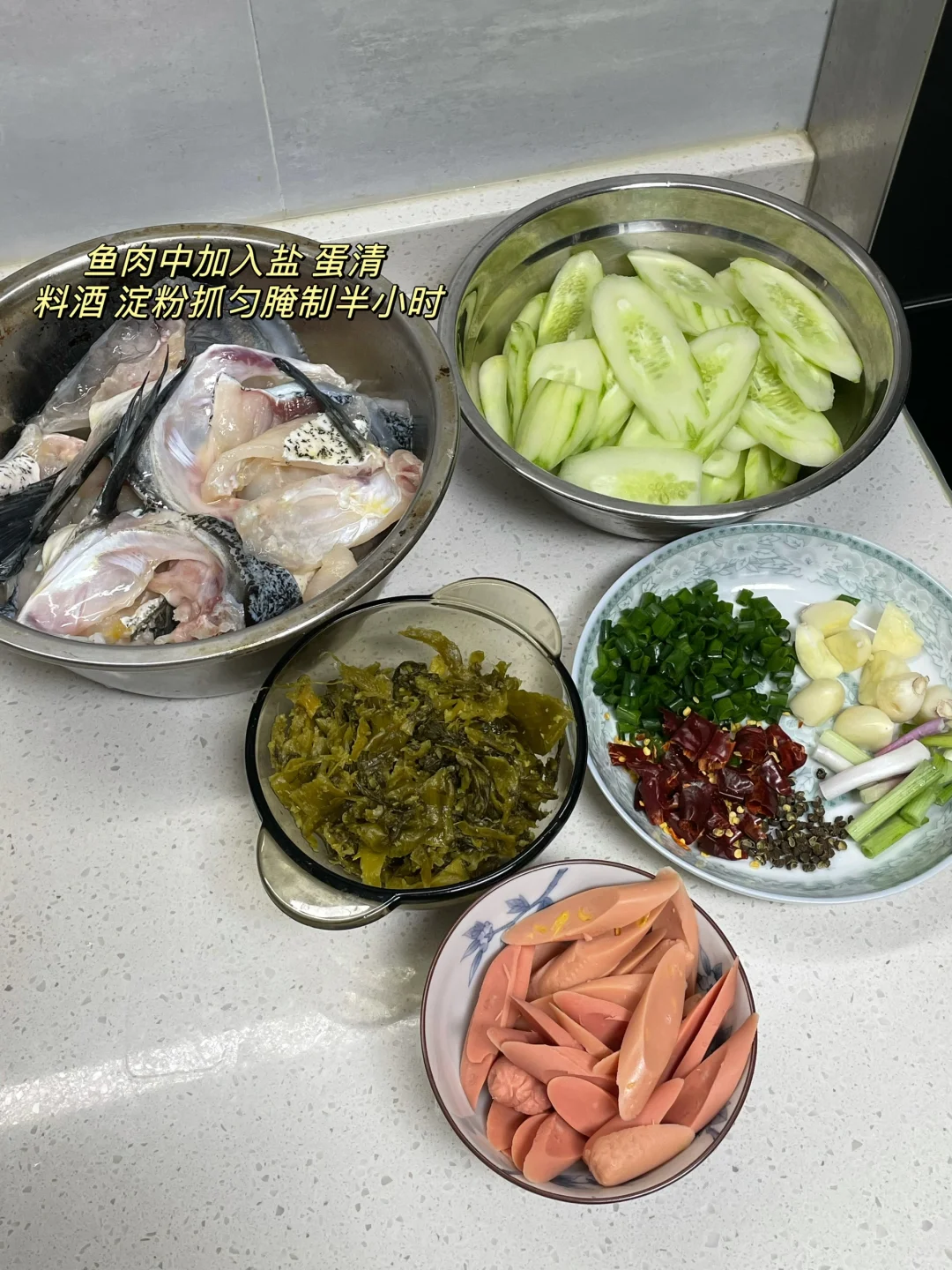 超级好吃的酸菜鱼,开胃解腻巨下饭,汤汁直接可以泡两碗饭吃 1⃣️:鱼肉洗净控干水分,加两勺盐 少许料酒 蛋清 适量淀粉抓匀腌制半小时 2⃣️:锅中油热倒入酸菜 大蒜 葱段炒香,加入开水熬煮出酸味,加少许盐和胡椒粉调味,再放入配菜煮熟捞出打底 3⃣️:放入鱼骨和鱼头煮熟捞出用,再放入鱼片烫熟捞出,碗中放入干花椒干辣椒 葱花白芝麻和少许辣椒慢,淋热油激香即可