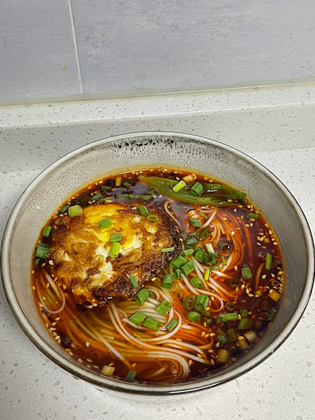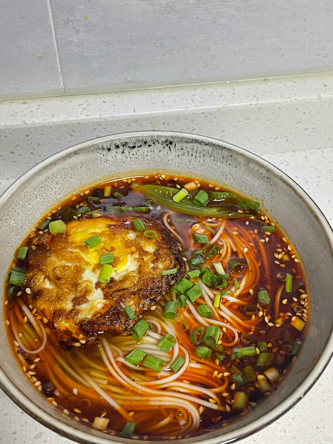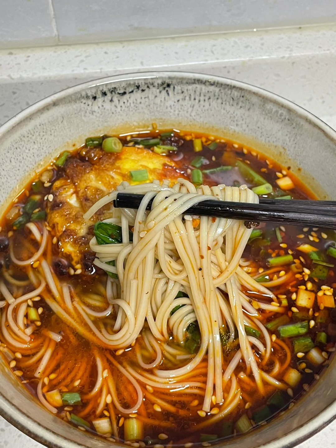 重庆小面yyds,麻麻辣辣,加个煎蛋更有仪式感,调料是灵魂,简单又过瘾 调料:葱花 蒜末 白芝麻 辣椒面淋热油,盐 生抽 陈醋 花椒面 香油 猪油 胡椒粉 辣椒油 调料汁加入面汤,水开下面条和青菜煮熟捞出放入碗中拌匀即可