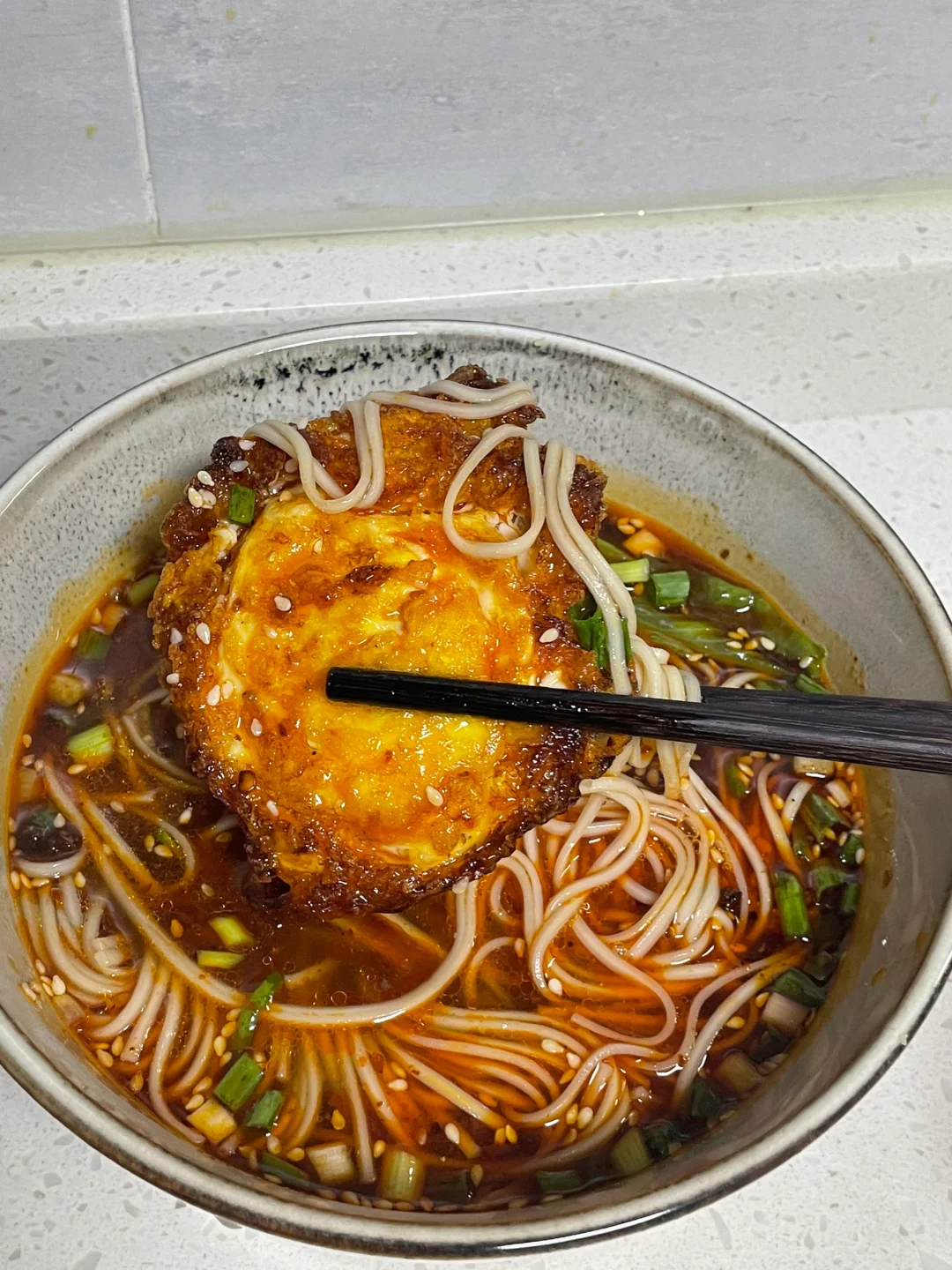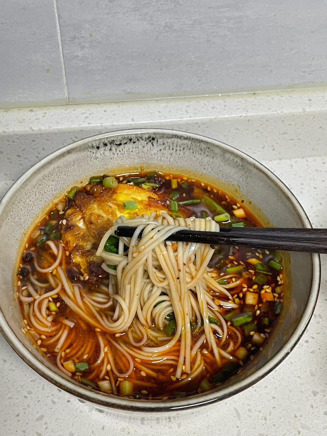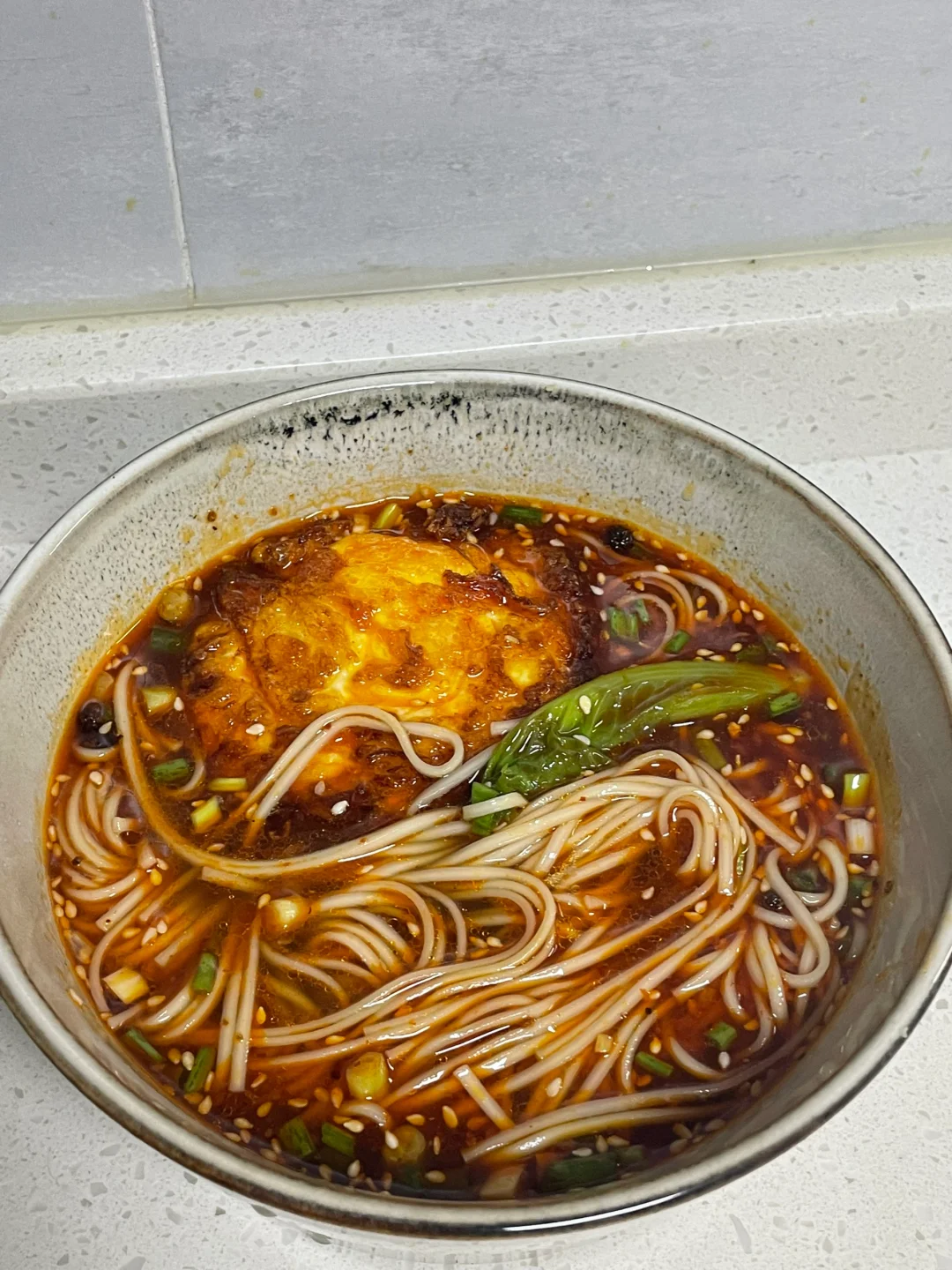重庆小面yyds,麻麻辣辣,加个煎蛋更有仪式感,调料是灵魂,简单又过瘾 调料:葱花 蒜末 白芝麻 辣椒面淋热油,盐 生抽 陈醋 花椒面 香油 猪油 胡椒粉 辣椒油 调料汁加入面汤,水开下面条和青菜煮熟捞出放入碗中拌匀即可