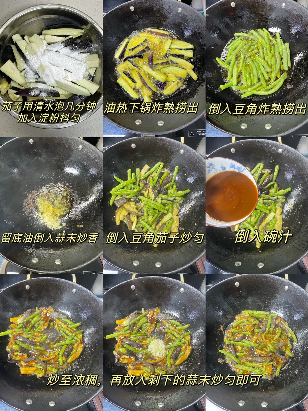 没胃口的时候一定要试试茄子烧豆角,茄子和豆角都是应季菜,既新鲜又好吃 1⃣️:茄子洗净切成条,用清水泡几分钟控干水分,放入适量淀粉抓匀,豆角切成长条控干水分 2⃣️:准备好碗汁,一勺老抽 两勺生抽 半勺盐 半勺白糖 少许鸡精 一勺蚝油 一勺淀粉搅匀 3⃣️:锅中多到一些油,油热放入茄子炸熟捞出,再放入豆角炸熟捞出 4⃣️:锅中留底油放入蒜末炒香,再倒入茄子和豆角炒匀,倒入碗汁炒至浓稠,再放入一些蒜末炒匀即可